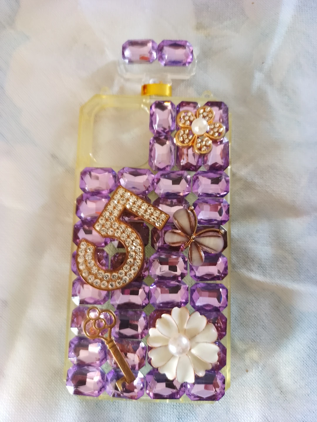 Selling a rhinestone iPhone case. It's in great condition and has a unique design with purple rhinestones, a gold number 5, and flower embellishments