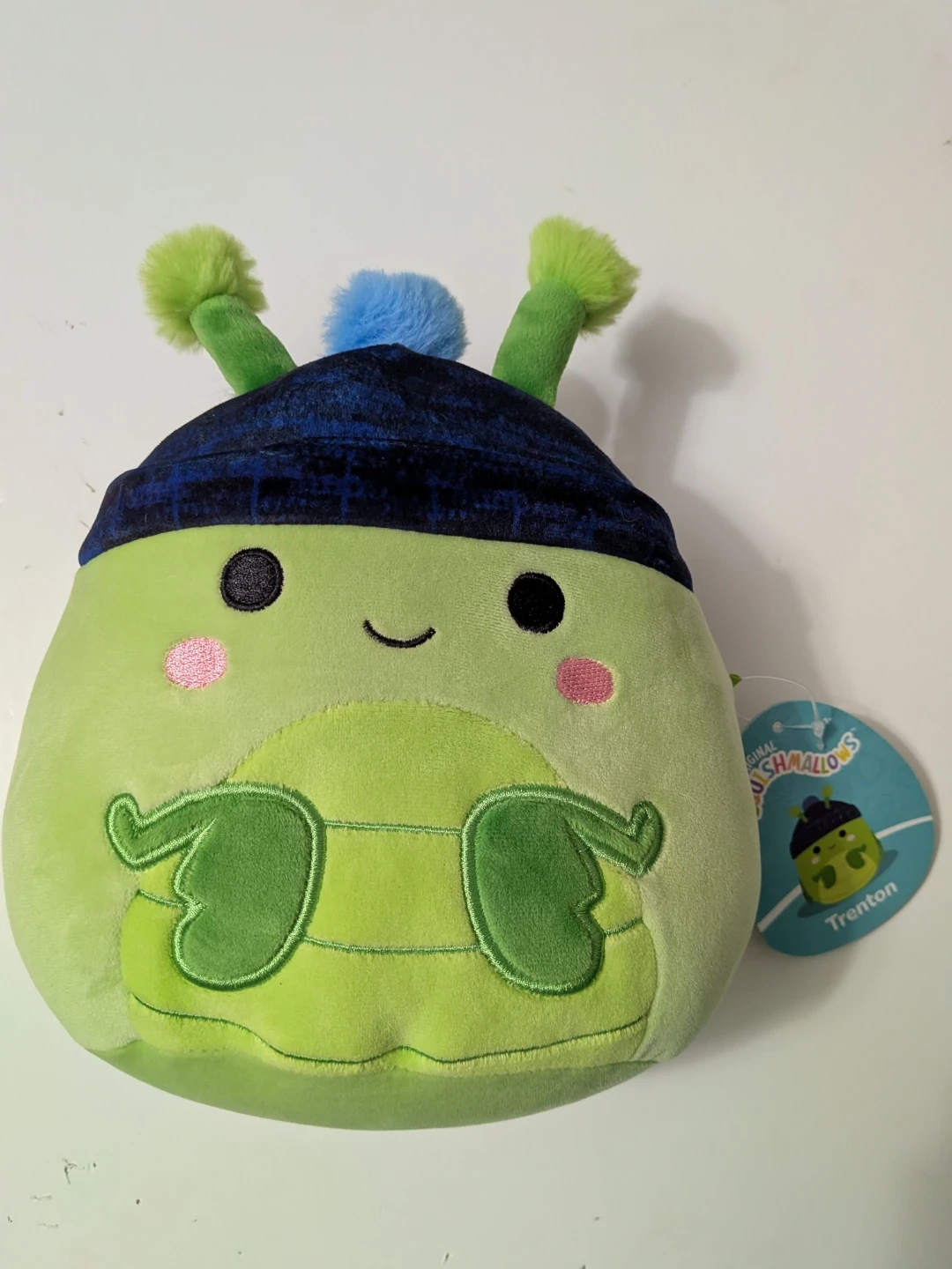 Meet Trenton, a super soft plush toy from Squishmallows. It's made with a cuddly material and features a cute design with a beanie and antennae. This plush is perfect for snuggling!