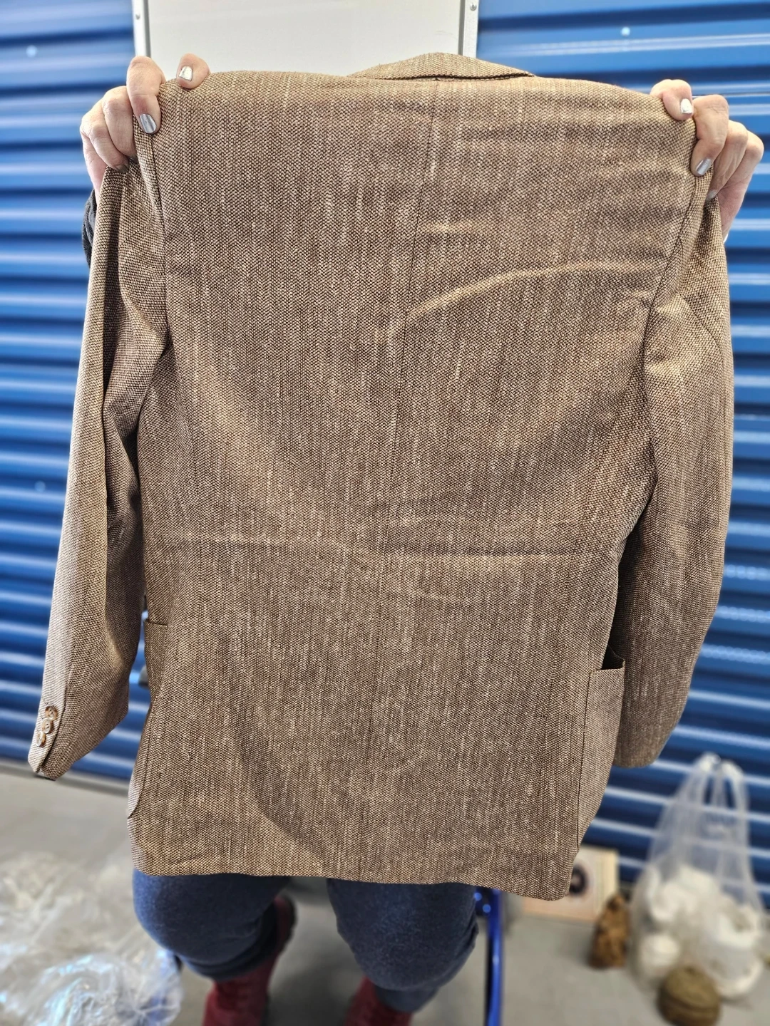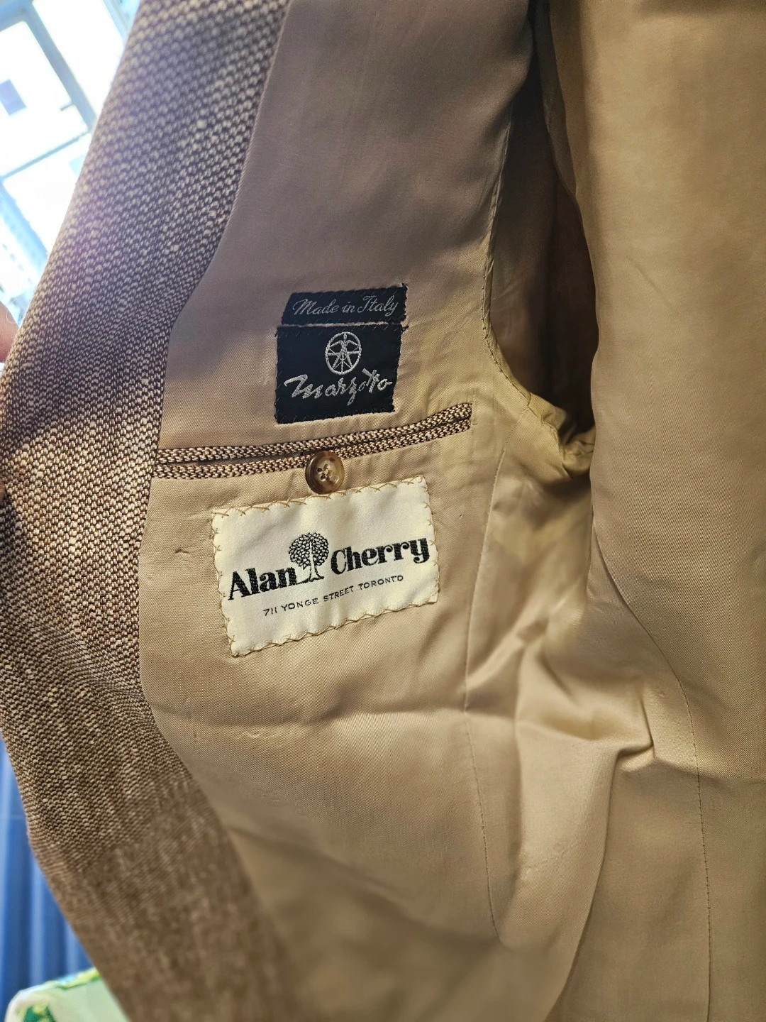 This is a men's blazer by Alan Cherry, made by Marzotto. It's a classic brown tweed style, perfect for layering. The blazer was made in Italy.