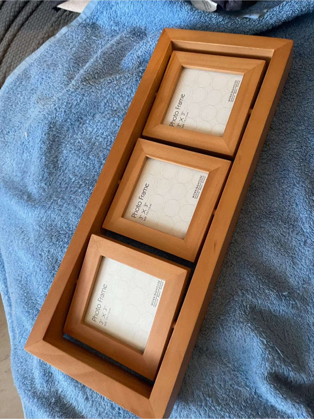 Selling a WORKINGHOUSE photo frame that holds three 3" x 3" photos. It's a lovely way to display your favourite memories! The frame is in great condition and would look great in any room.