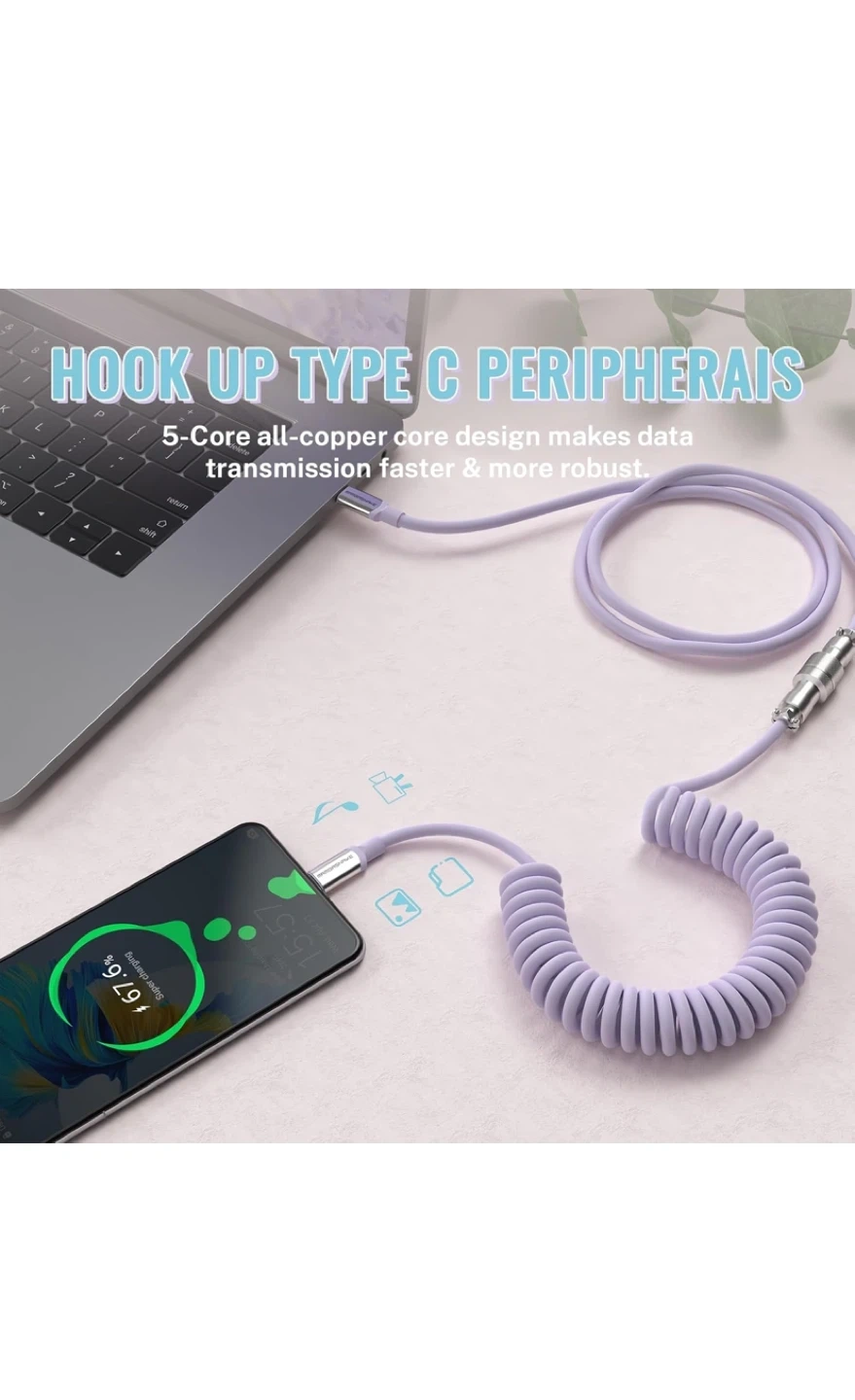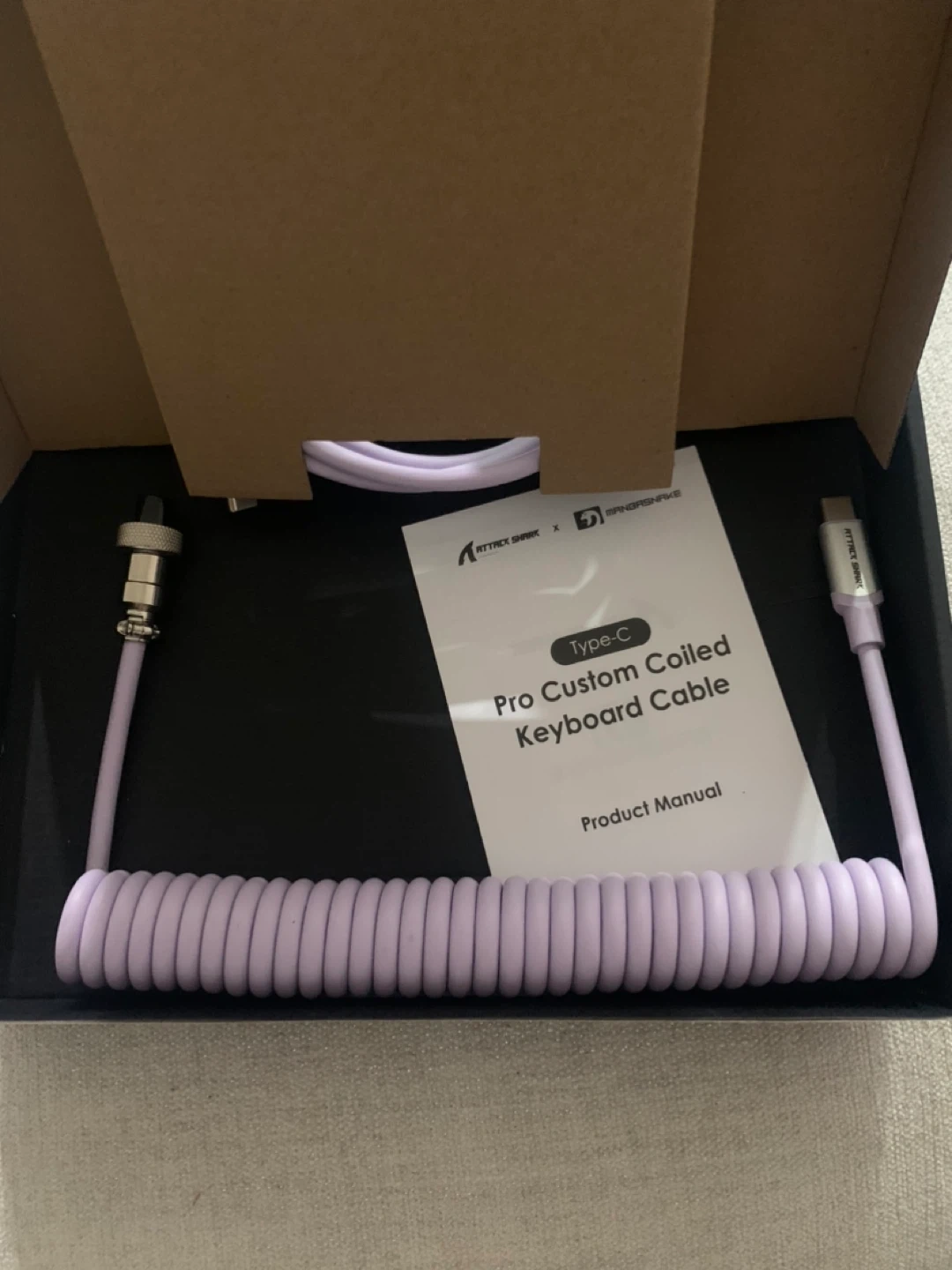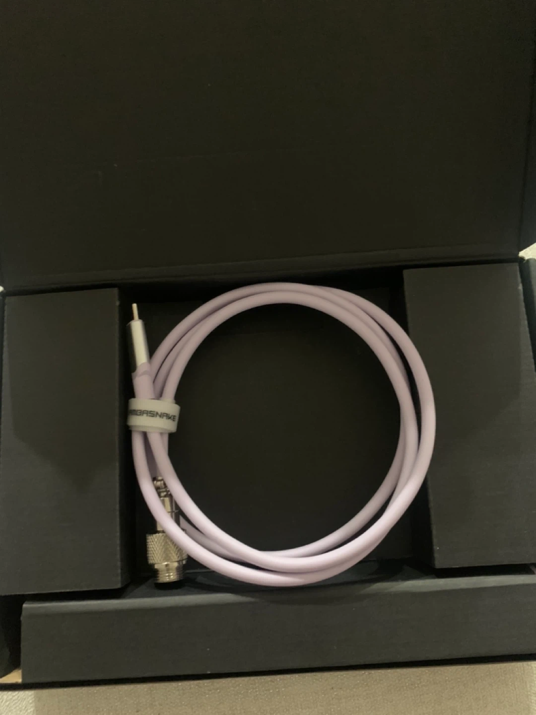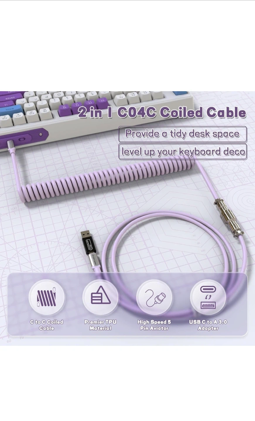 This is a MAMBASNAKE Pro Custom Coiled Keyboard Cable. It's a Type-C to C coiled cable with a USB C to A 3.0 adapter. Premier TPU material.