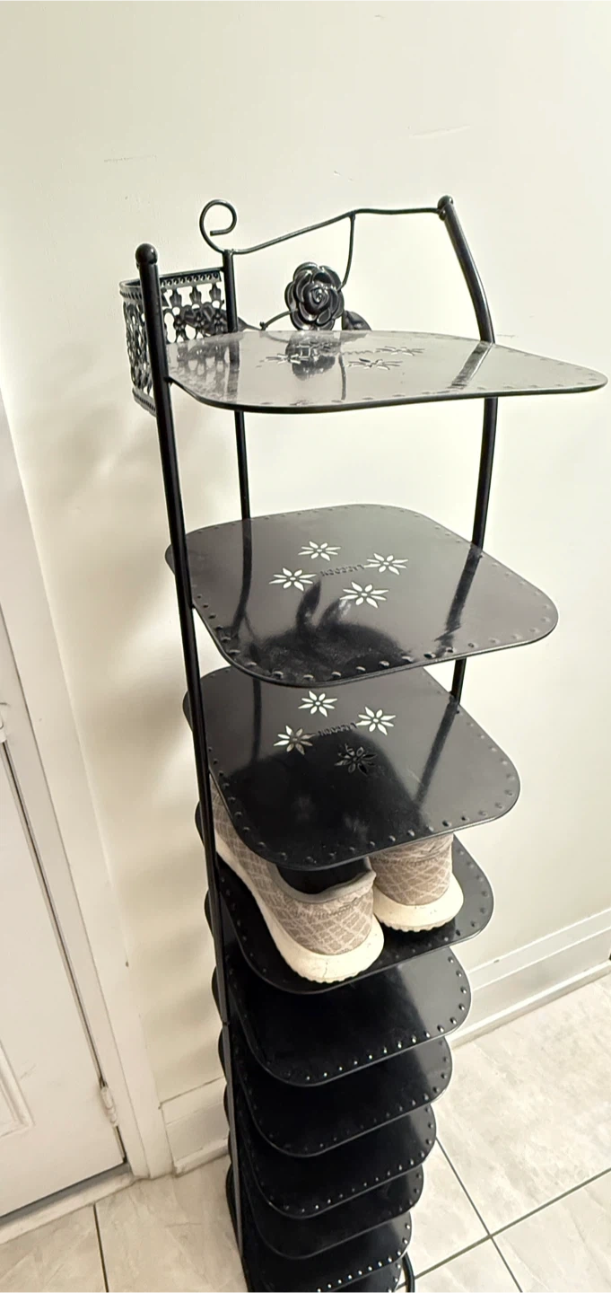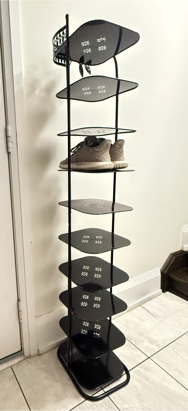This black metal shoe rack offers ten tiers of storage. It features decorative cutouts on each shelf . Its slim profile makes it great for entryways or closets.