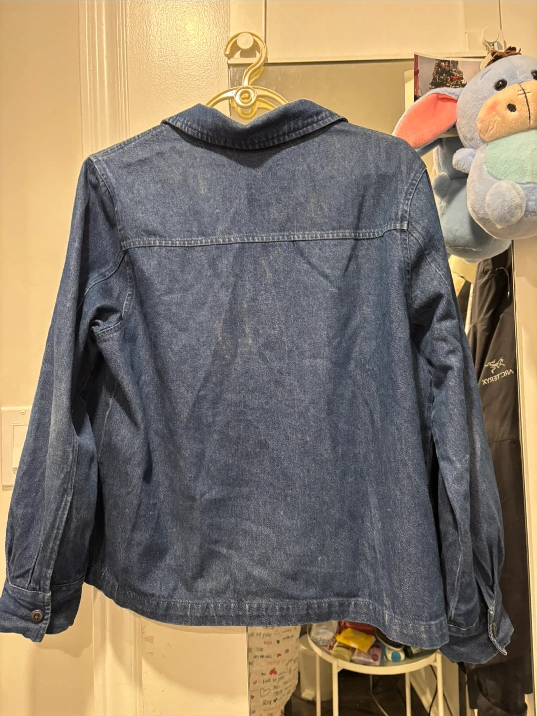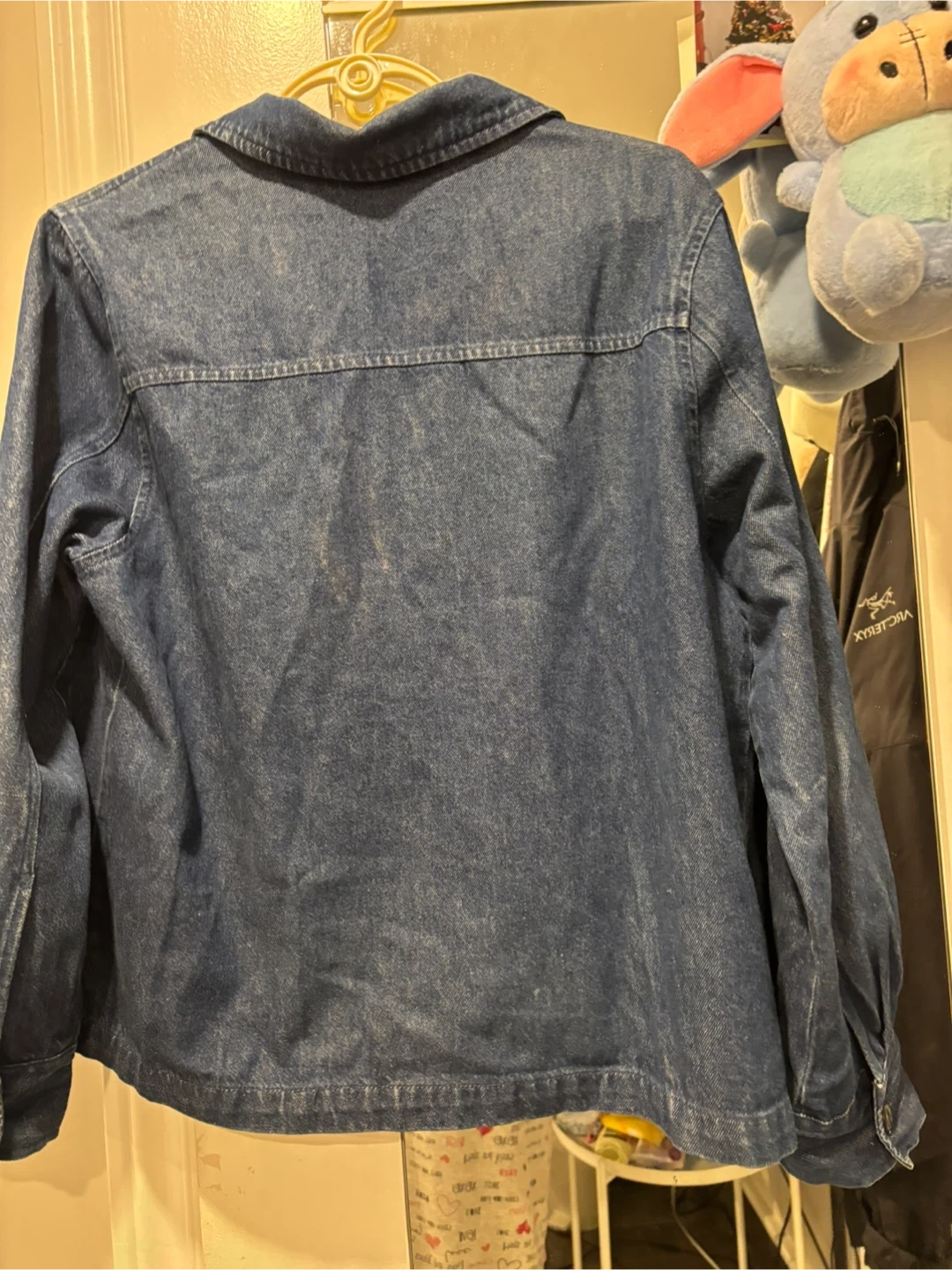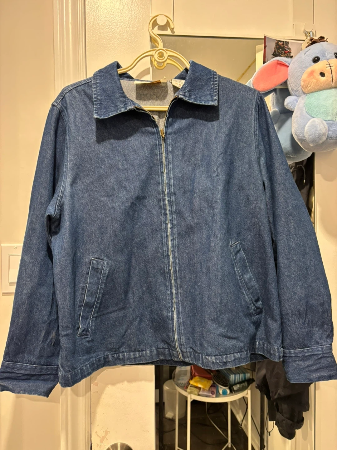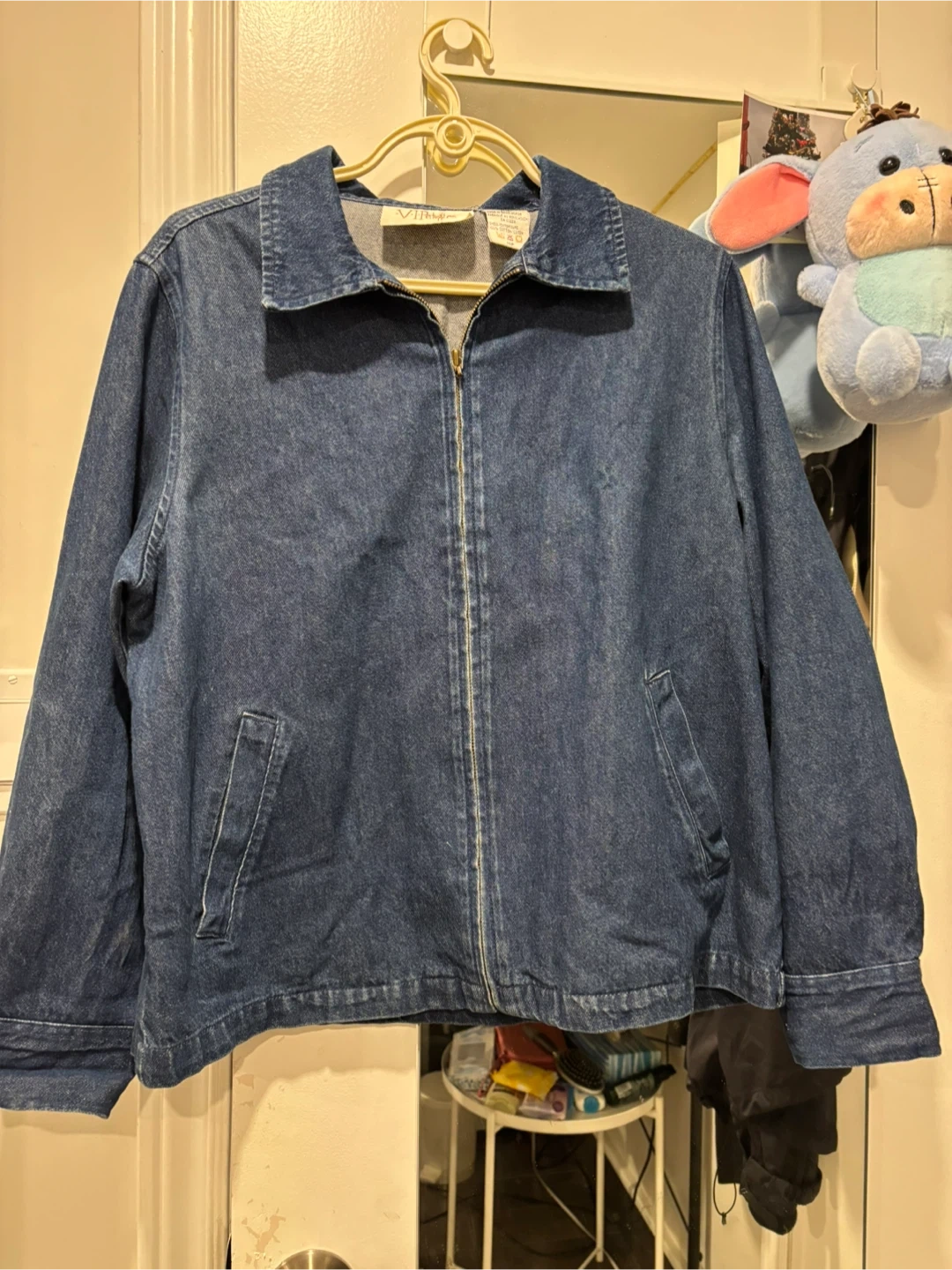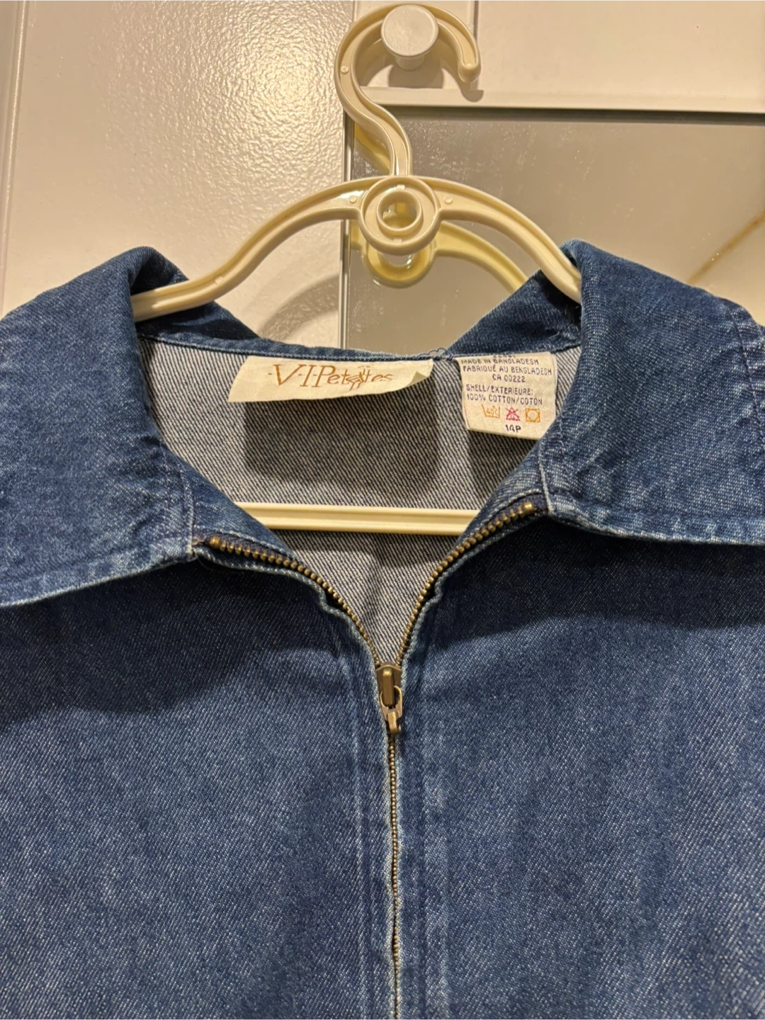 This is a blue denim jacket from VIP Petites. It's a size 14P and features a zip-up front with a collared neckline. Made from a cotton blend.