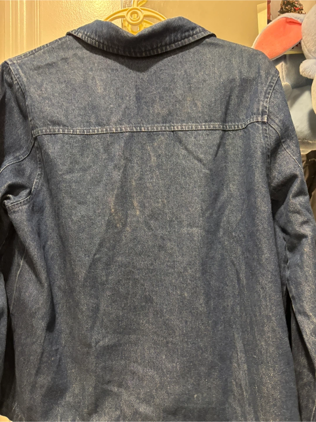 This is a blue denim jacket from VIP Petites. It's a size 14P and features a zip-up front with a collared neckline. Made from a cotton blend.