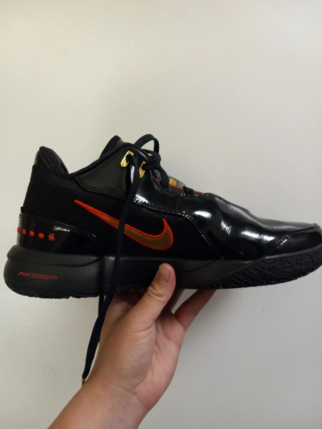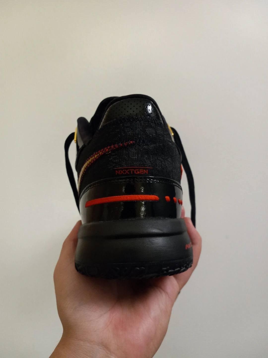 These are lebron nxxt gen Nike basketball shoes in black with orange and gold accents. They feature a shiny patent leather toe and side panels with a mesh heel. The sole has Zoom Air cushioning.