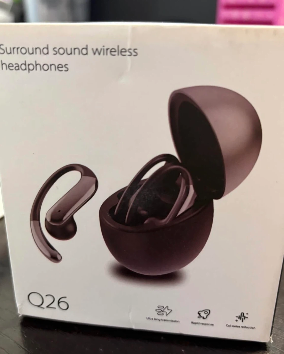 Surround sound wireless headphones with Q26 Ai model. Ultra long transmission and rapid response capabilities. Includes call noise reduction. They're Ai White.
