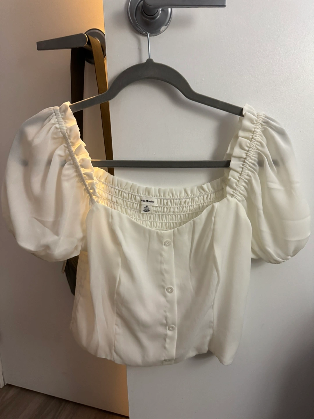 Off-white crop top. Puff sleeves. Button-up front. Elasticated neckline. Size M.