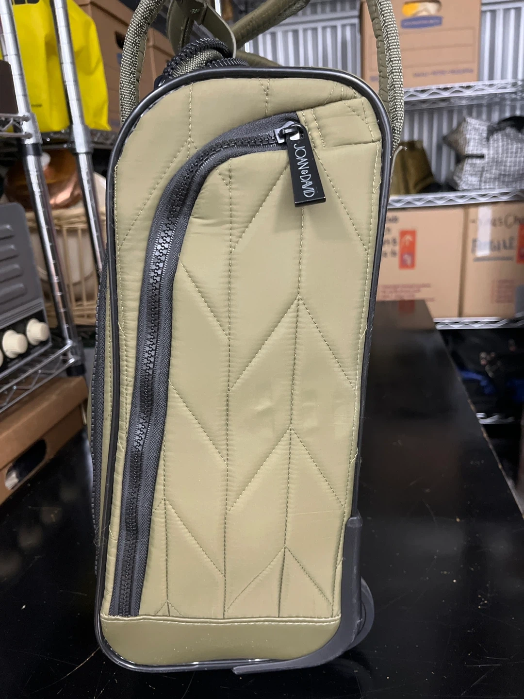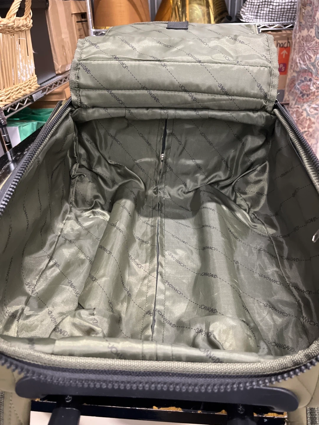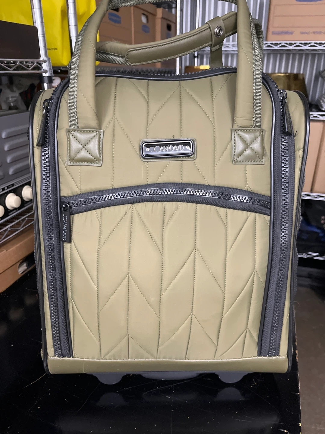 149This is a Joan David rolling small carry-on suitcase in an olive colour. It features a quilted design and has a retractable handle and wheels for easy transport. It's perfect for short trips or as a carry-on for longer journeys. There is some wear on the interior laptop section - frayed edge (see photos). The bag has been used once.