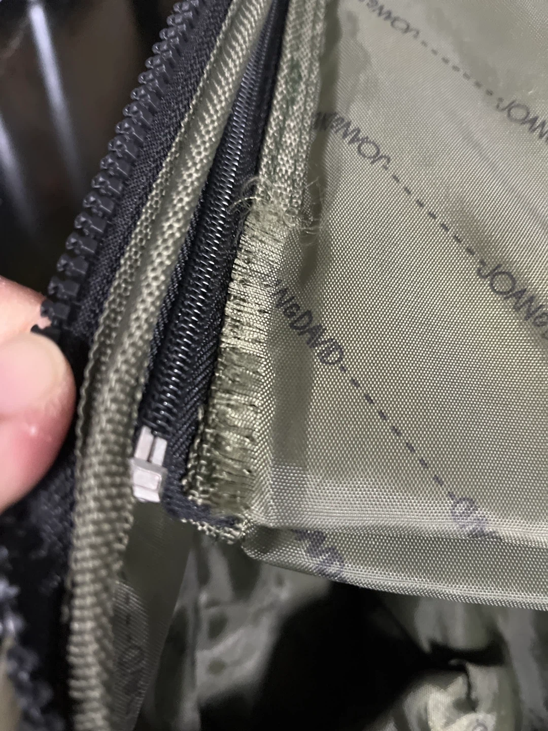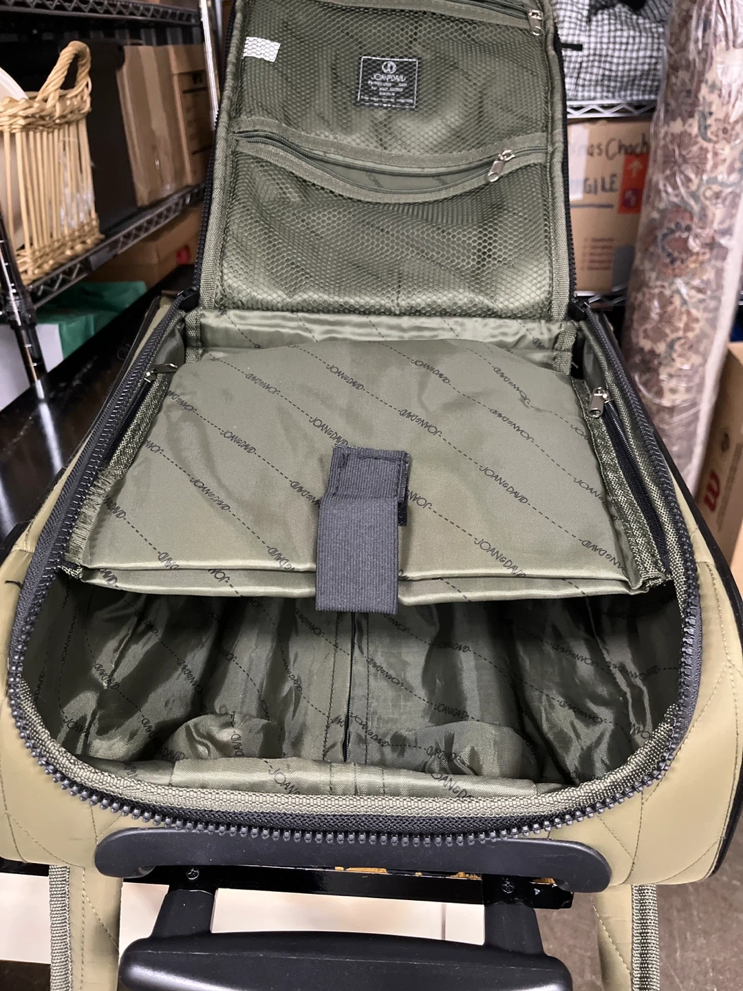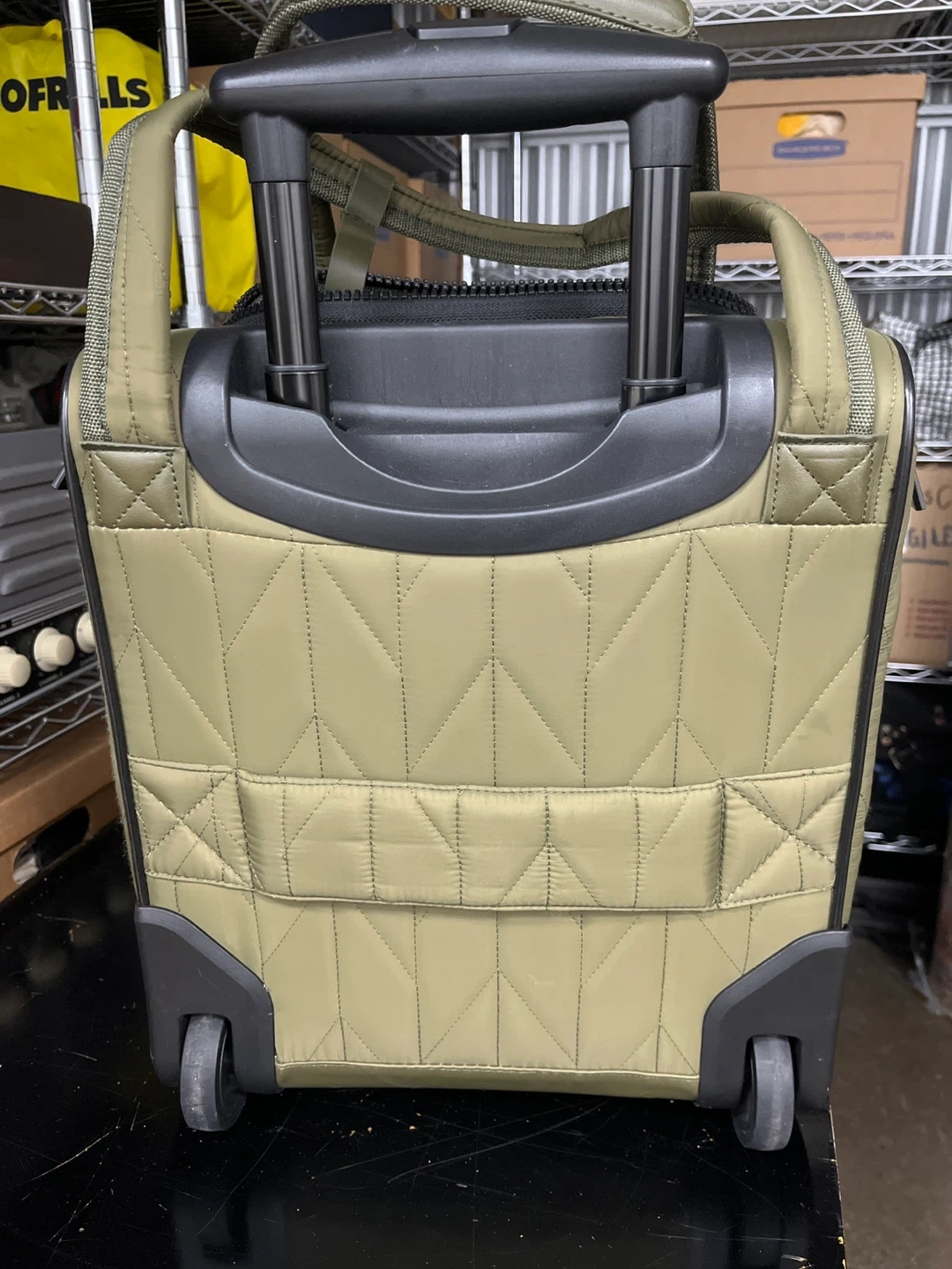 149This is a Joan David rolling small carry-on suitcase in an olive colour. It features a quilted design and has a retractable handle and wheels for easy transport. It's perfect for short trips or as a carry-on for longer journeys. There is some wear on the interior laptop section - frayed edge (see photos). The bag has been used once.