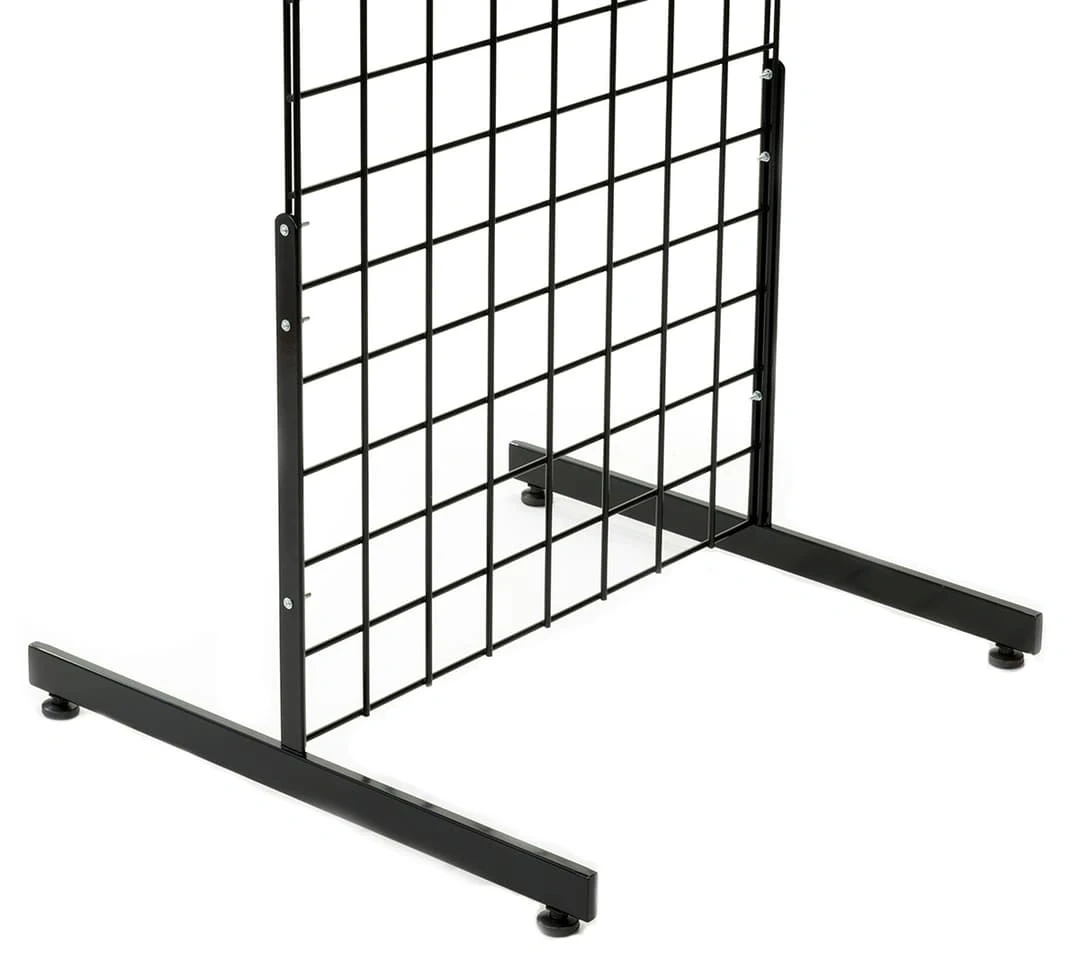 This is a black metal grid display stand base. It's made of metal and has adjustable feet. Some rust is present on one of the base connections. Does not effect it however for function.