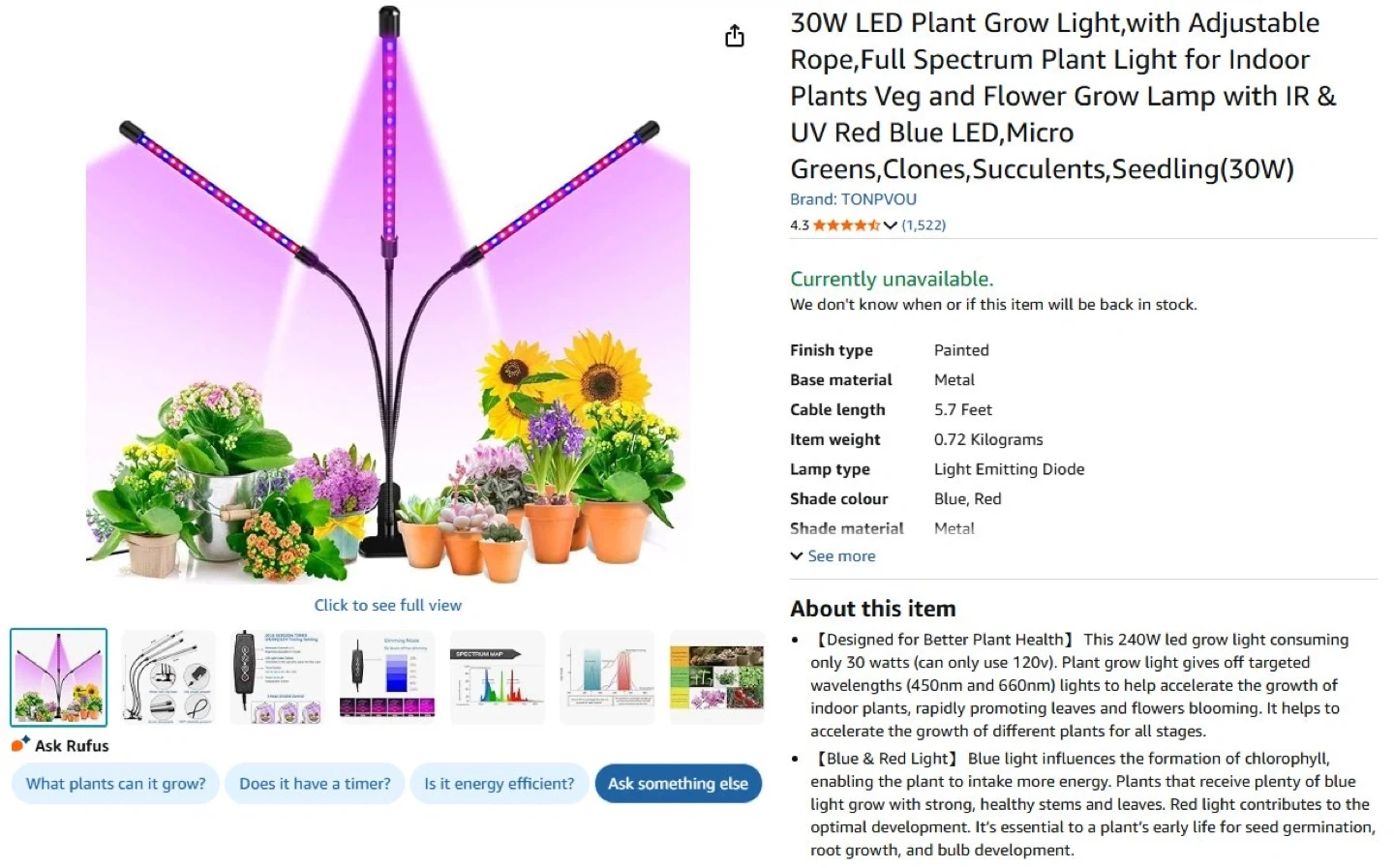 Selling a LED grow light with a clip. It features three adjustable light bars and a control panel for easy operation ( pink/blue or mixed light).