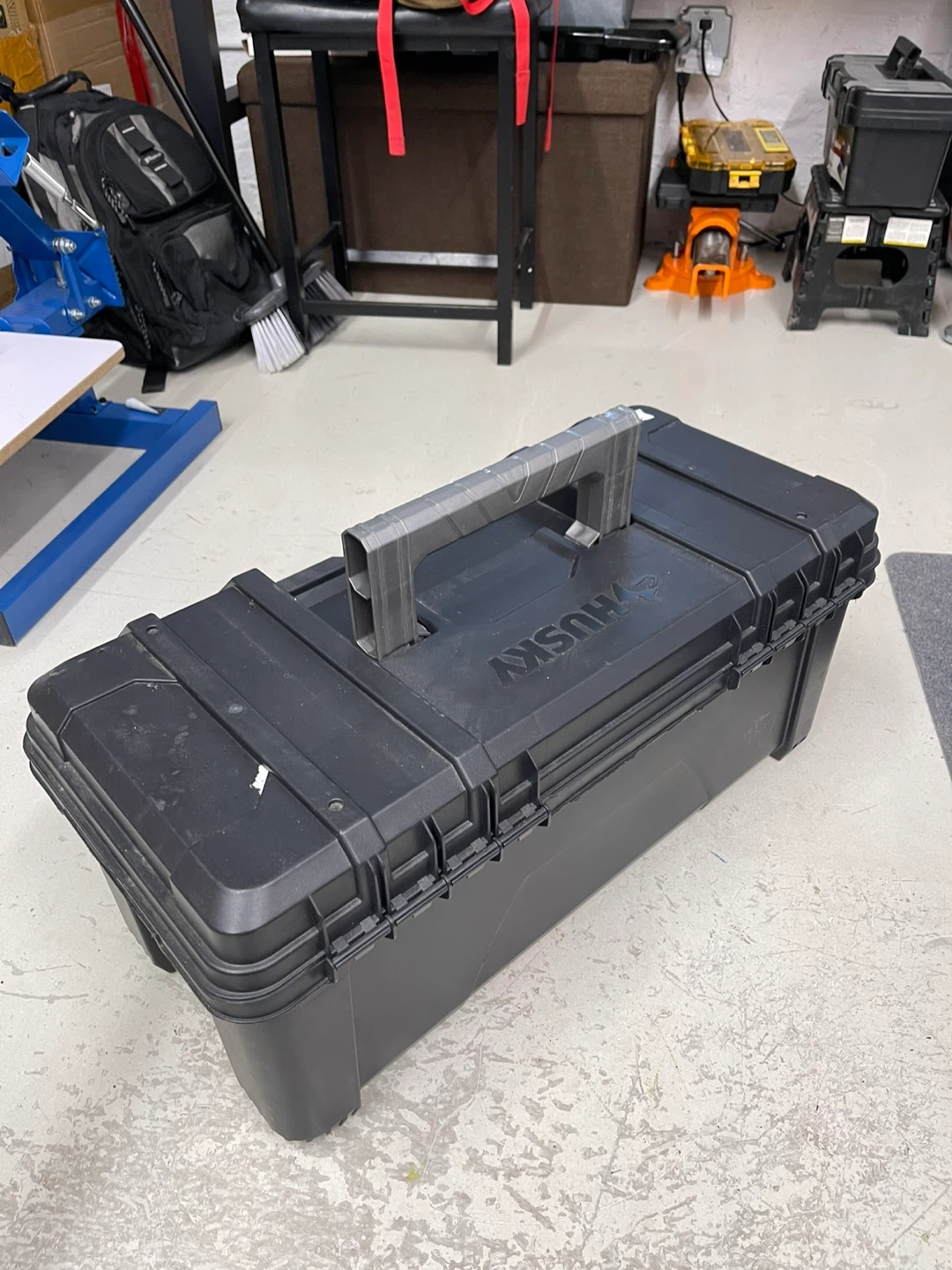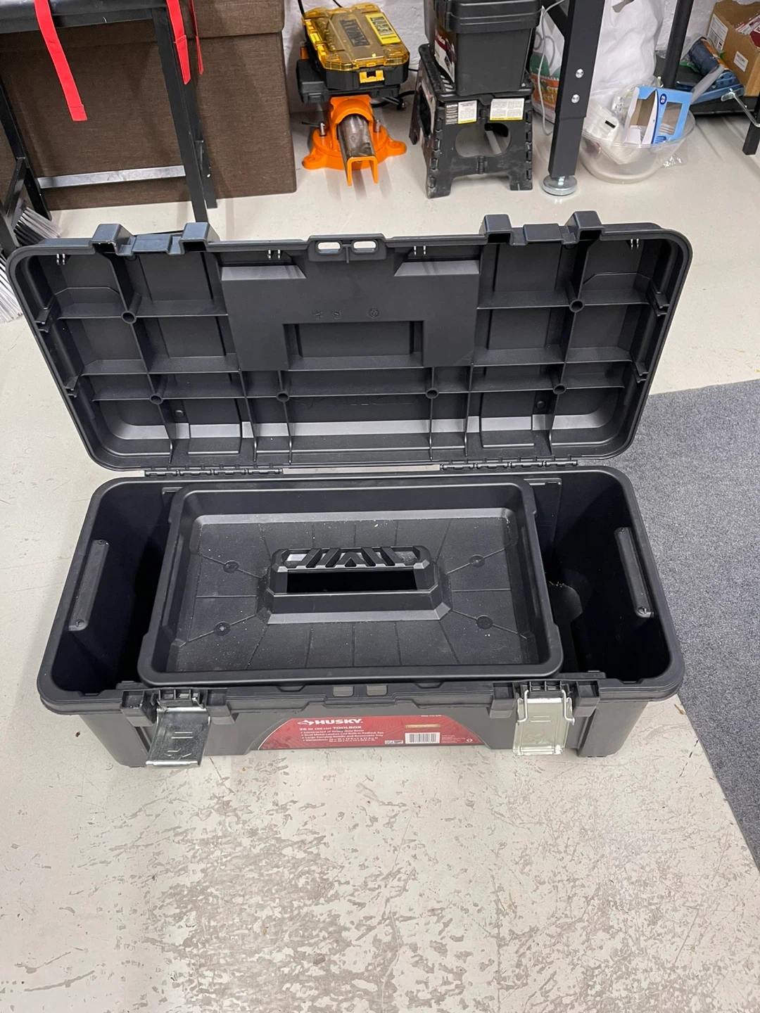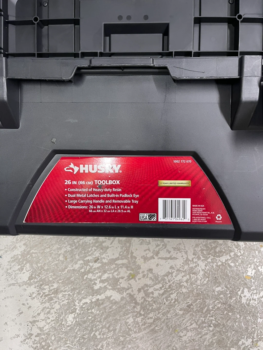 This is a Husky 26 inch toolbox. It's constructed of heavy-duty resin and features dual metal latches and a built-in padlock eye. It also has a large carrying handle and a removable tray.