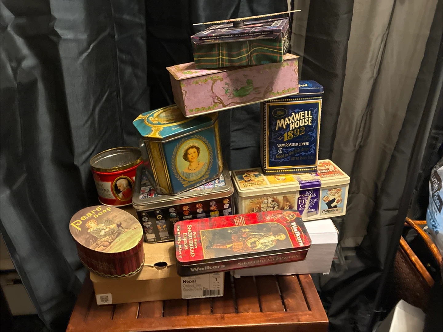 Selling a collection of vintage decorative tins! There's a variety of brands and designs, including Pears Soap, Maxwell House, Walkers Shortbread Fingers, and Cadbury's. Perfect for collectors or anyone looking to add a touch of nostalgia to their home decor