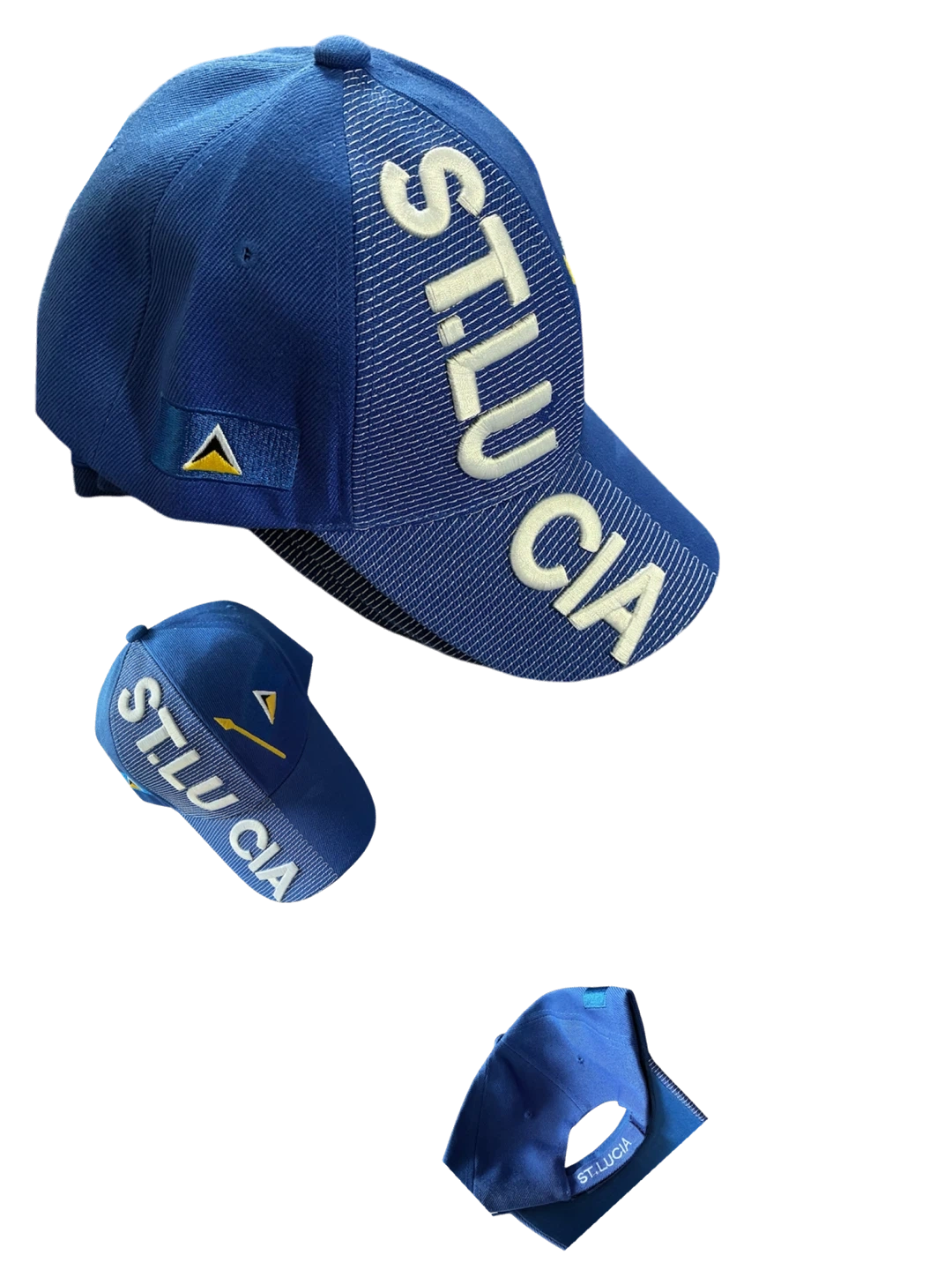 This is a blue baseball cap featuring "ST.LU.CIA" embroidered in white on the front. It also has a small triangular emblem on the side. The phrase "ST.LU.CIA" is also visible on the underside of the brim. It's a great souvenir cap!