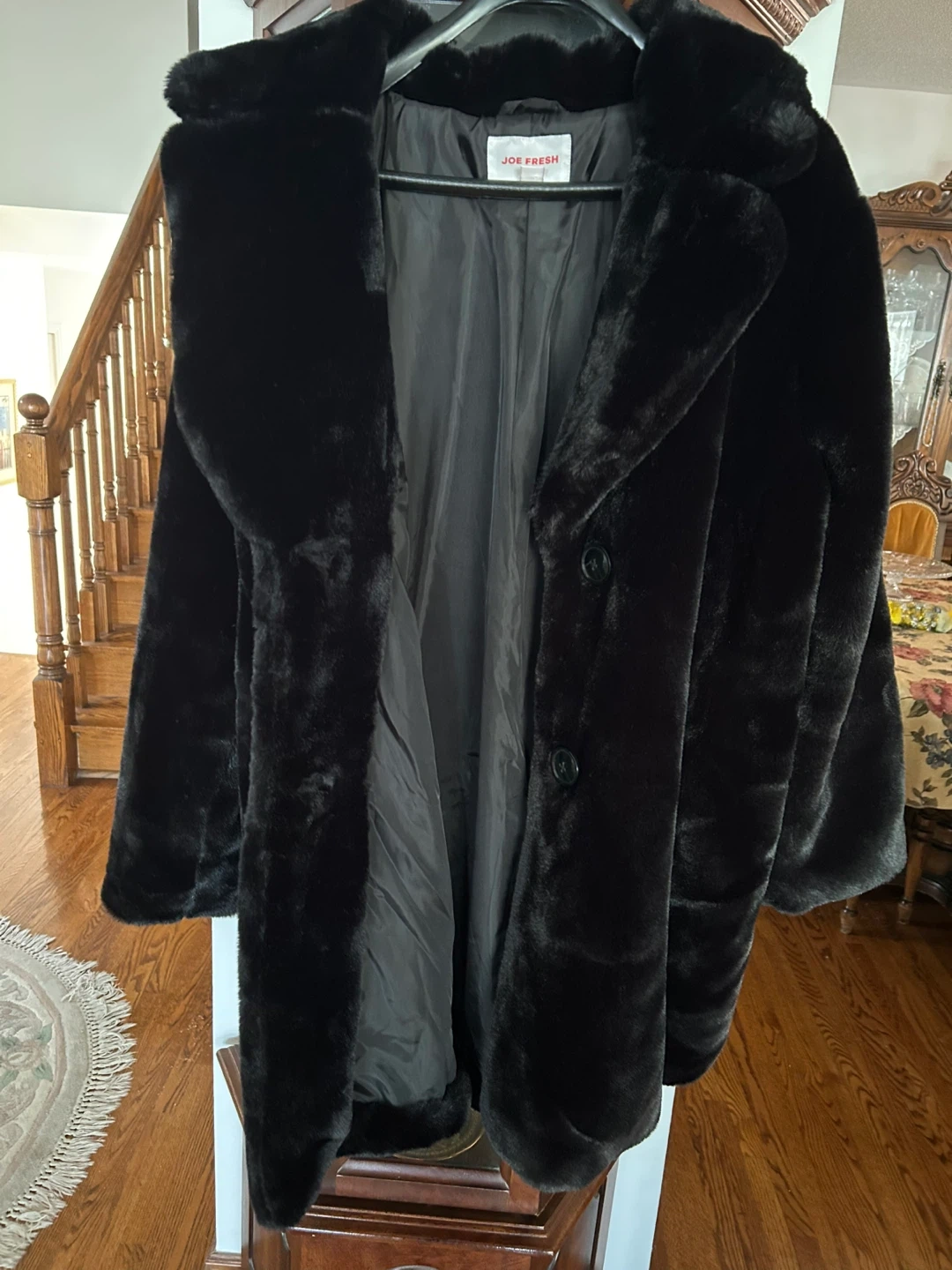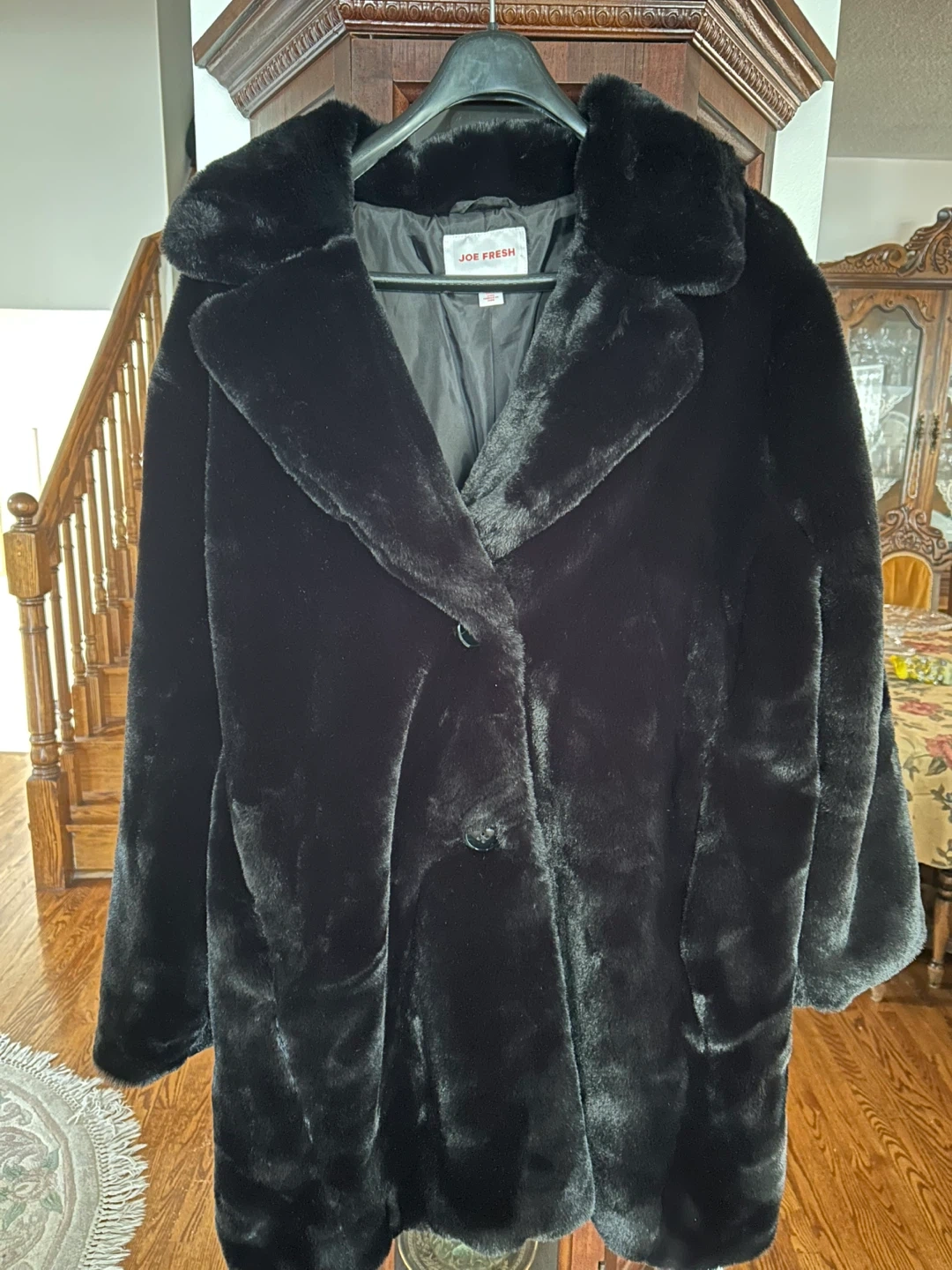 Cozy up in this stylish Joe Fresh faux fur coat! It's a size XL and in excellent condition. Perfect for adding a touch of elegance to any outfit! Large deep pockets. Super warm .