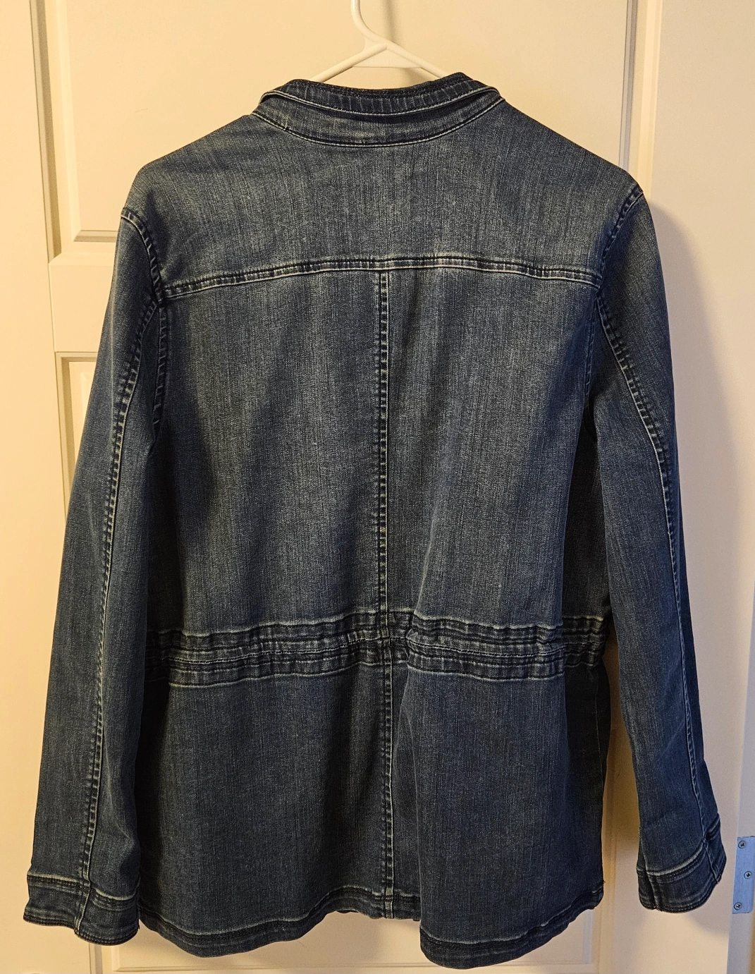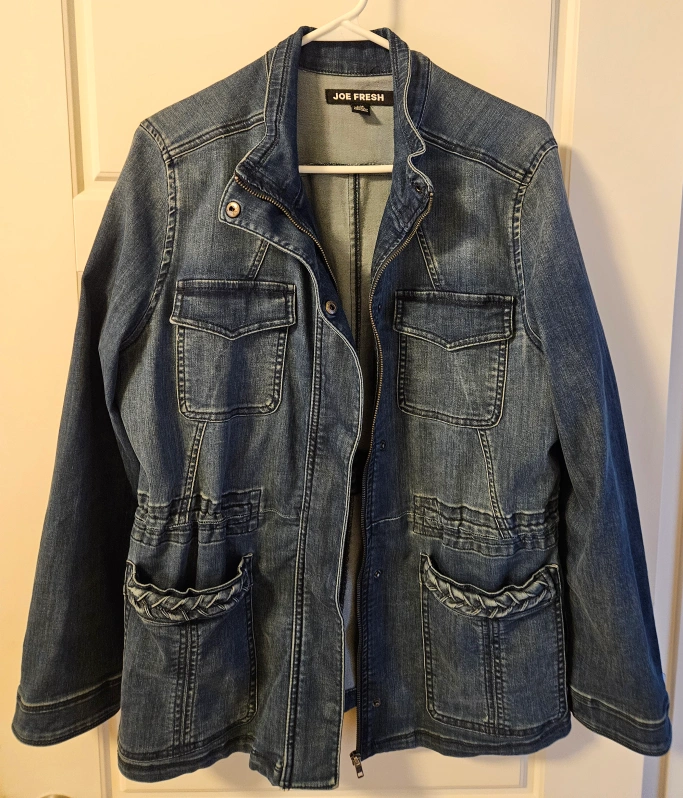 10I'm selling a Joe Fresh denim jacket size large! The jacket is in great condition and features a stylish design with a zipper front, functional pockets and a comfortable fit. From a smoke free and pet free home. Porch pick up in St. Albert.