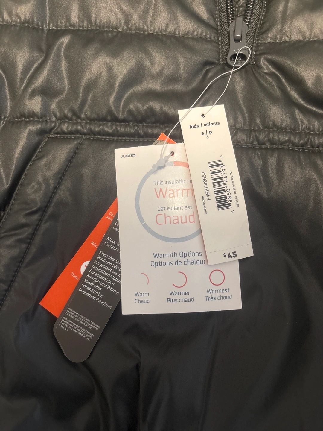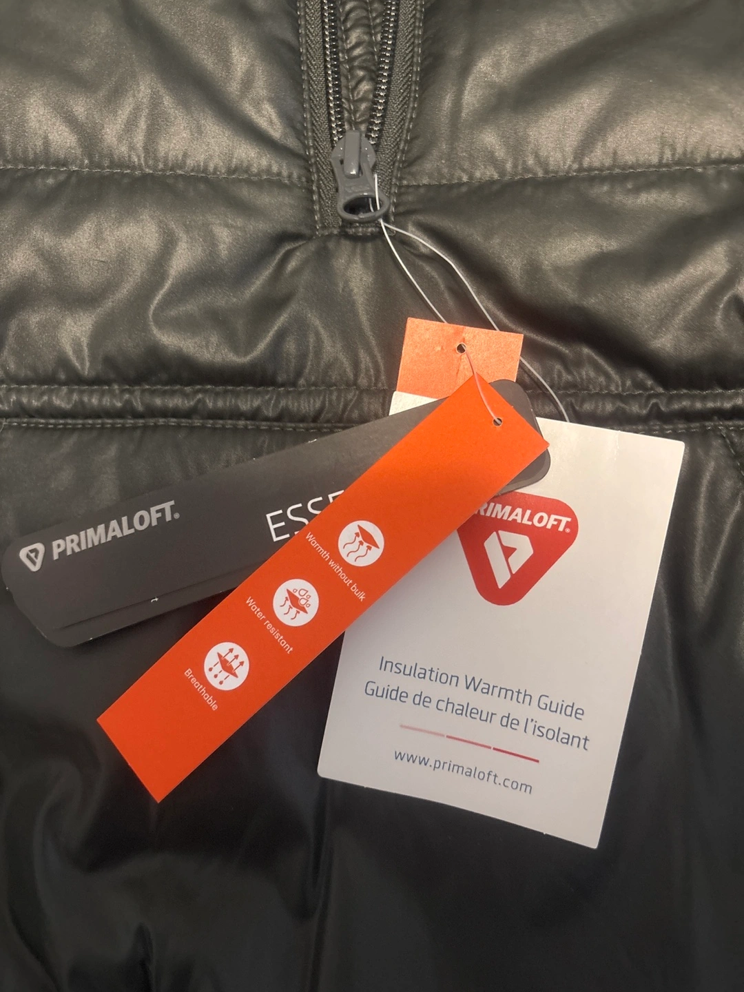 Olive green puffer jacket. Half-zip closure. Kangaroo pocket. Primaloft insulation. Brand new condition. Size 6.