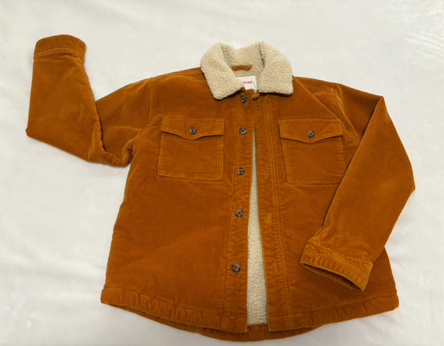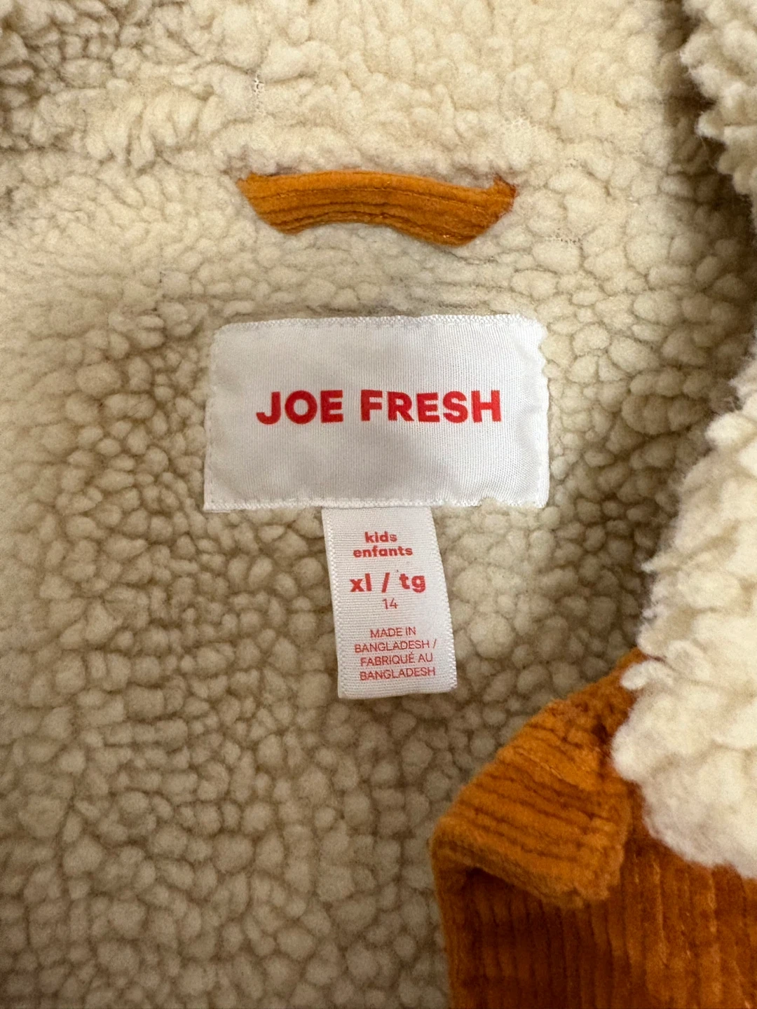 Cozy Joe Fresh kids jacket for sale! It's a size XL/TG 14. The jacket features a corduroy exterior and a warm sherpa lining. Perfect for keeping your little one snug during cooler weather