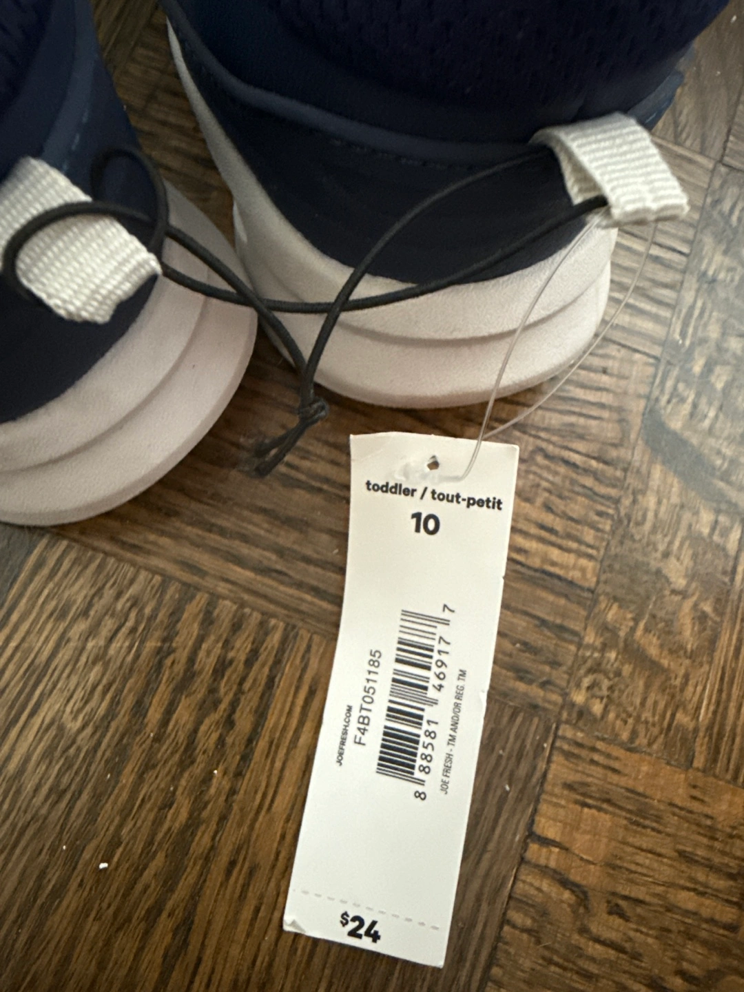 95These Joe Fresh toddler shoes are in excellent condition and ready for a new home! They are a size 10 and feature a stylish navy colour. The original price tag of $24 is still attached. Never worn!