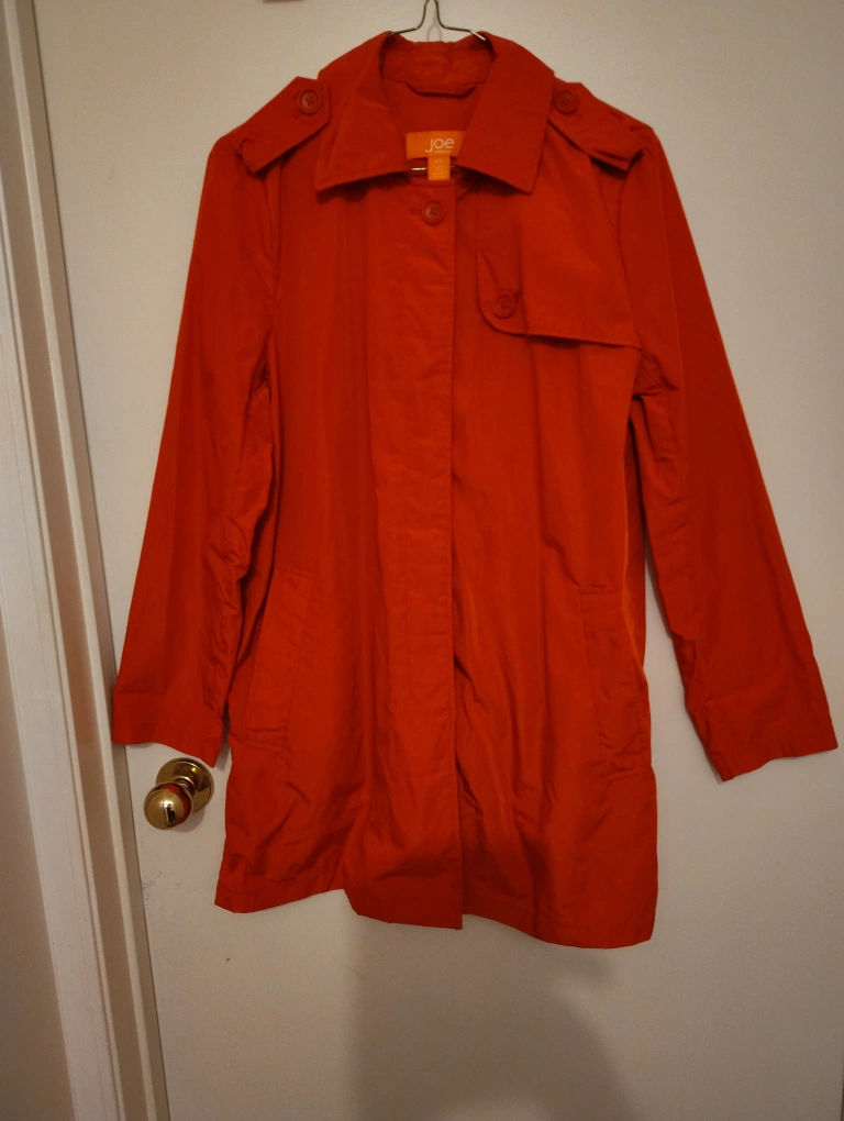 23Lightweight red trench coat. Button closure. Long sleeves. Pockets. Excellent condition.