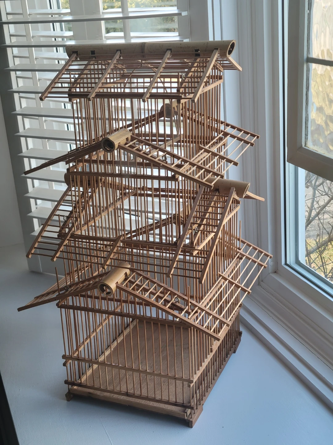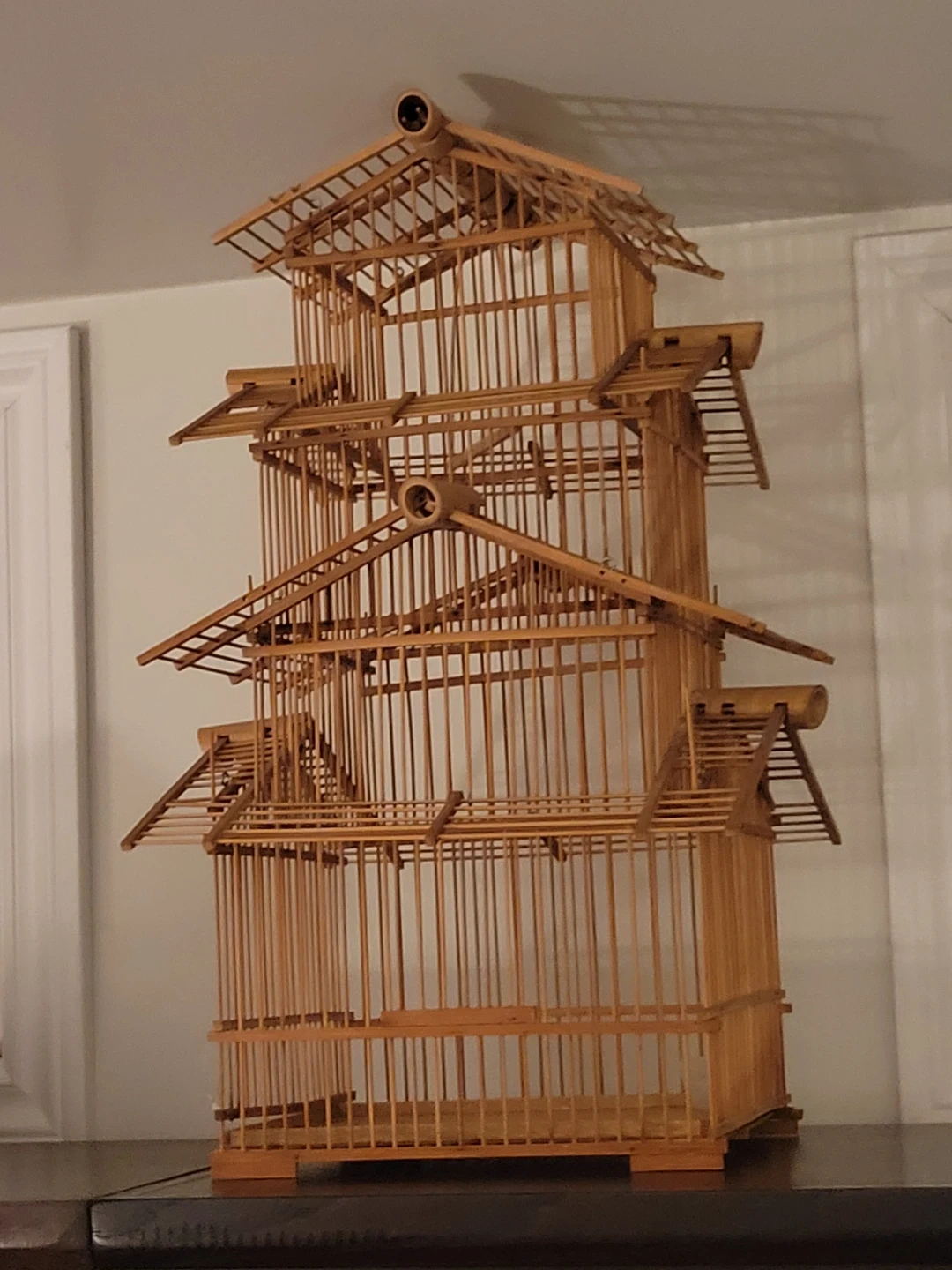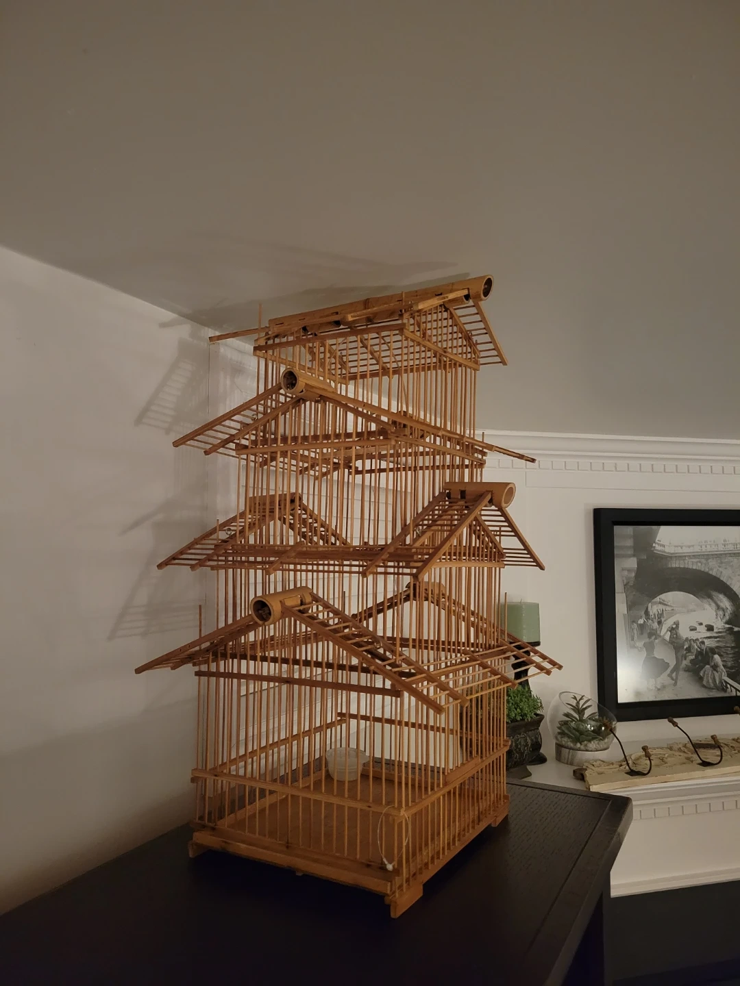 This vintage traditional pagoda-style birdhouse is crafted from bamboo, offering a unique decorative piece with a tiered design reminiscent of classic Asian architecture; it adds an exotic touch to any space, showcasing detailed craftsmanship in its layered roof and vertical supports. It is used, but in good condition.