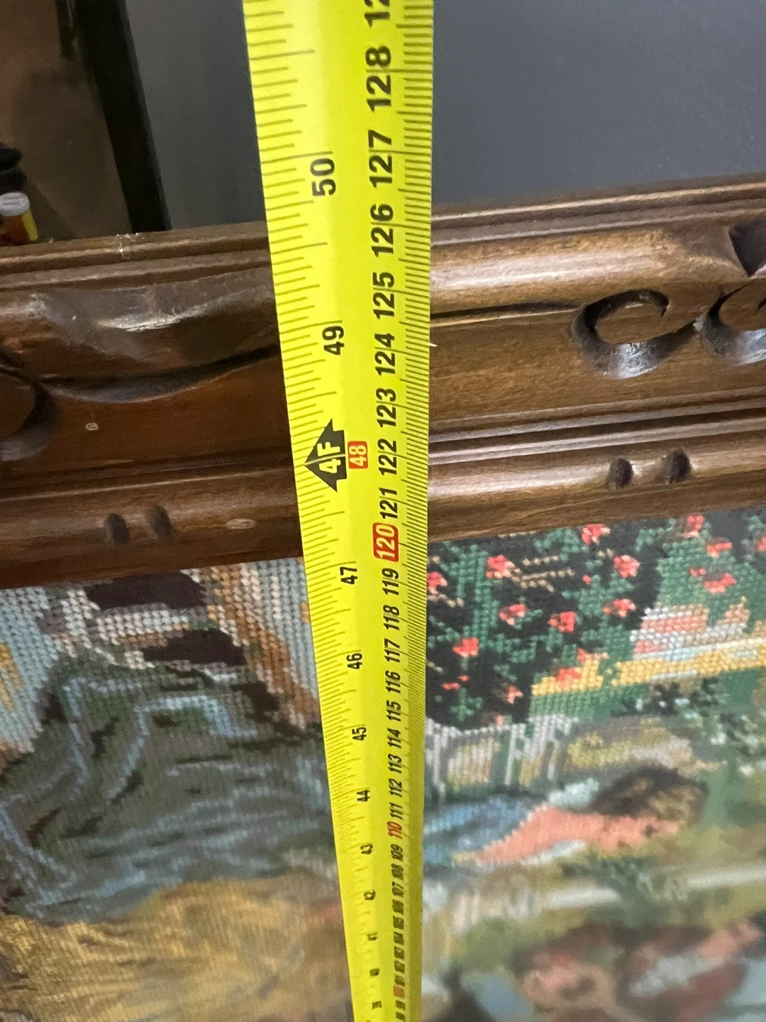 A vintage needlepoint tapestry depicting a garden scene with figures and a landscape. It's housed in an ornate dark wood frame. This piece would add a touch of classic charm to any room!