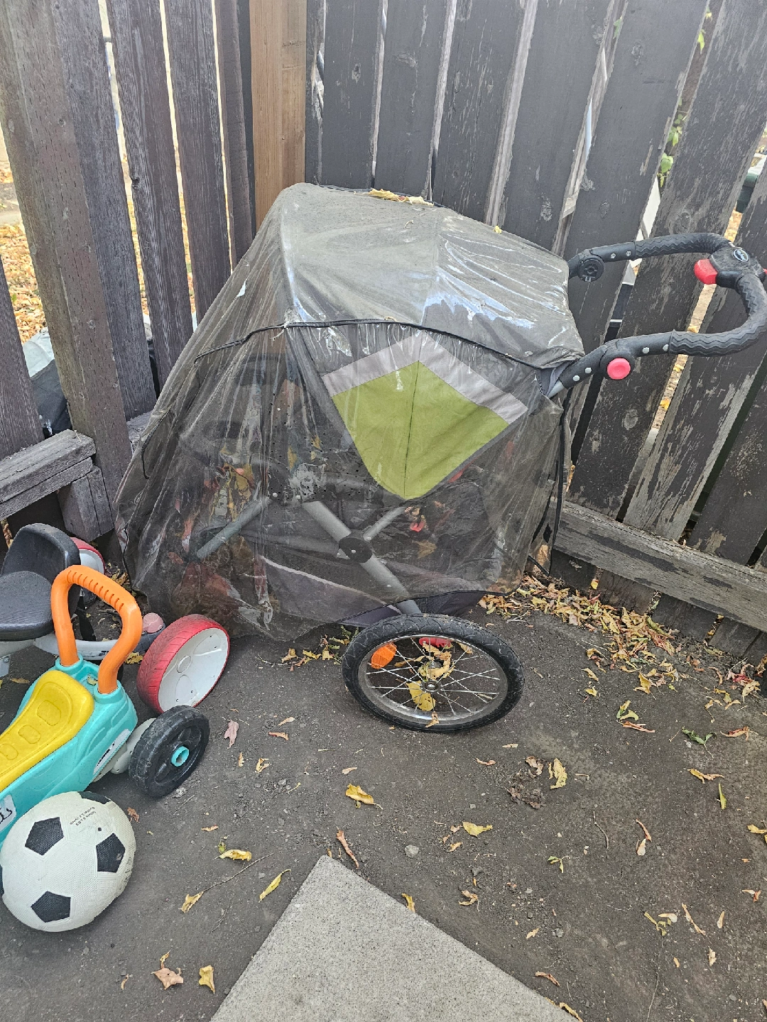 Jogging stroller in used condition. Could use a cleaning! a quick trip to a car wash it will be good as new.