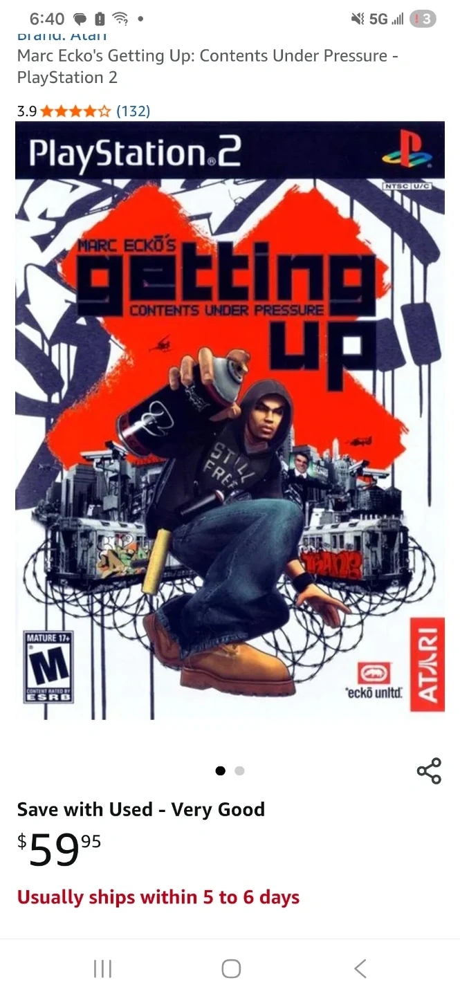 This is Marc Ecko's Getting Up for the PlayStation 2. It's rated M for Mature 17+ by the ESRB. This game is an action-adventure title.