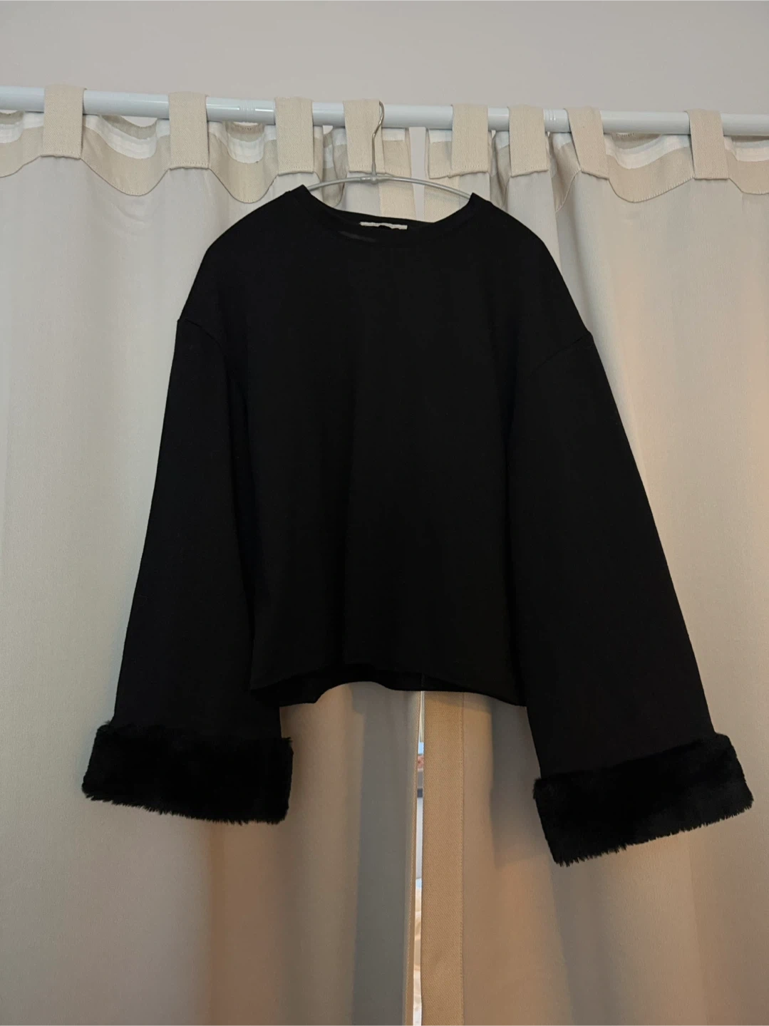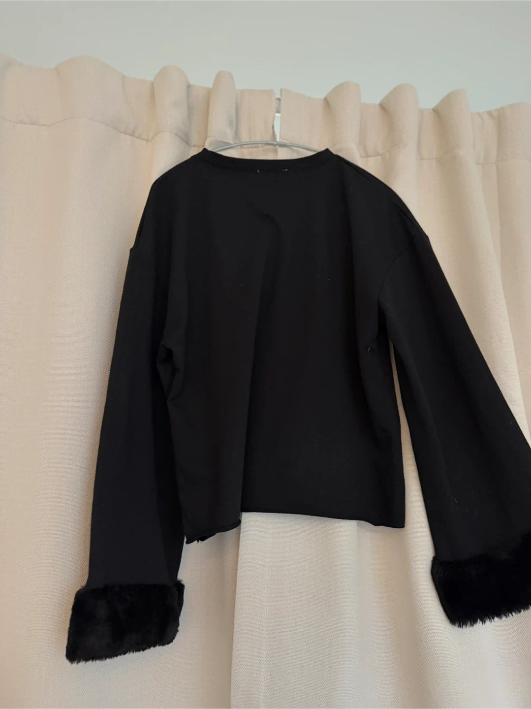 This black cropped sweatshirt features wide sleeves and faux fur cuffs. It's made from a soft material. Add a touch of cozy elegance to your outfit!