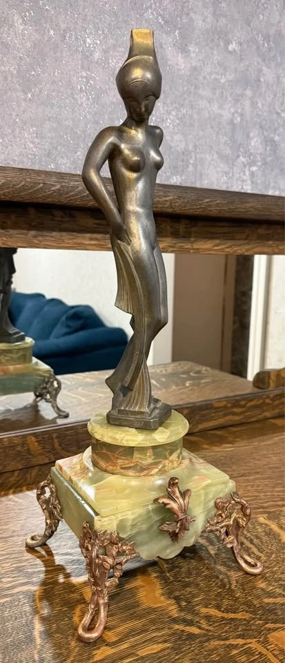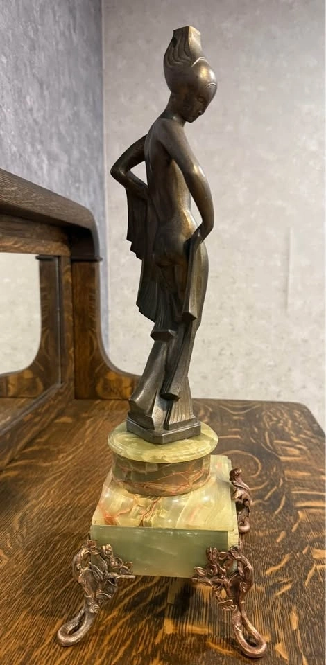 Elegant Art Deco style bronze sculpture depicting a classical female figure with graceful form and balanced proportions. The piece features a beautiful natural aged patina and is mounted on a genuine green onyx stone base. This sculpture reflects the timeless sophistication of the Art Deco period, making it a striking decorative statement for collectors or refined interiors. Details: Total height (with base): approx. 50 cm. Material: Cast bronze (hollow cast). Finish: Original aged patina. Base: Genuine green onyx. Solid and stable. Vintage condition with natural age-related character. A distinctive Art Deco piece that adds elegance and character to any space.