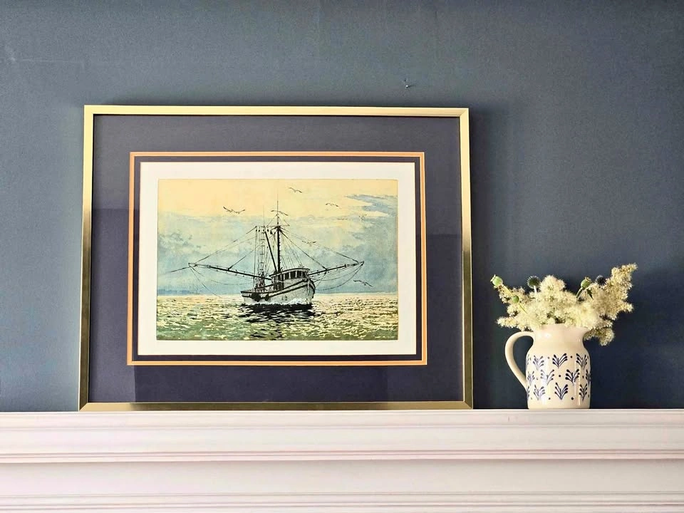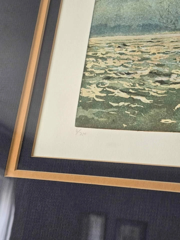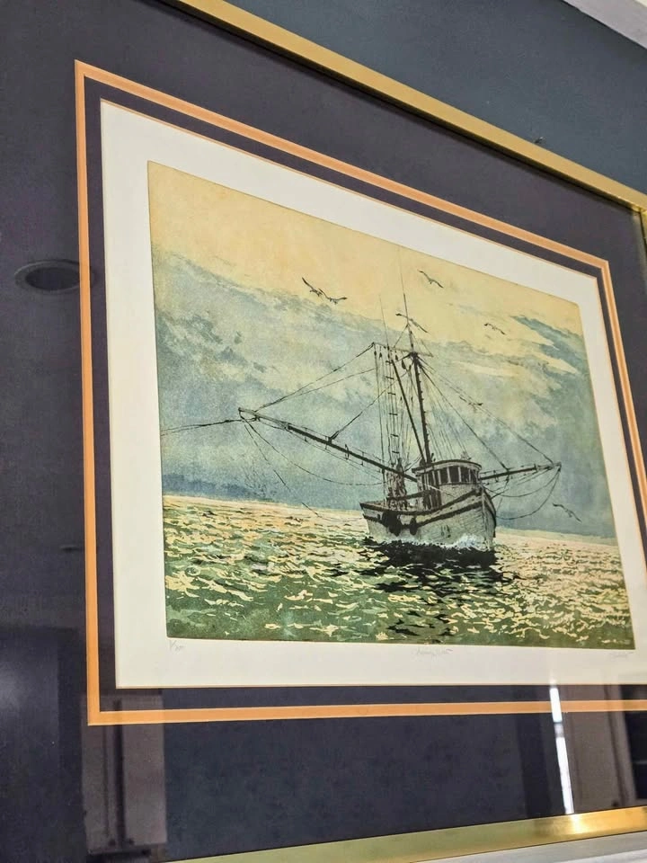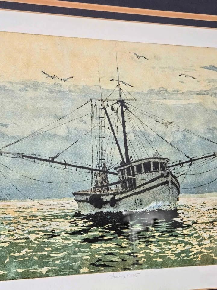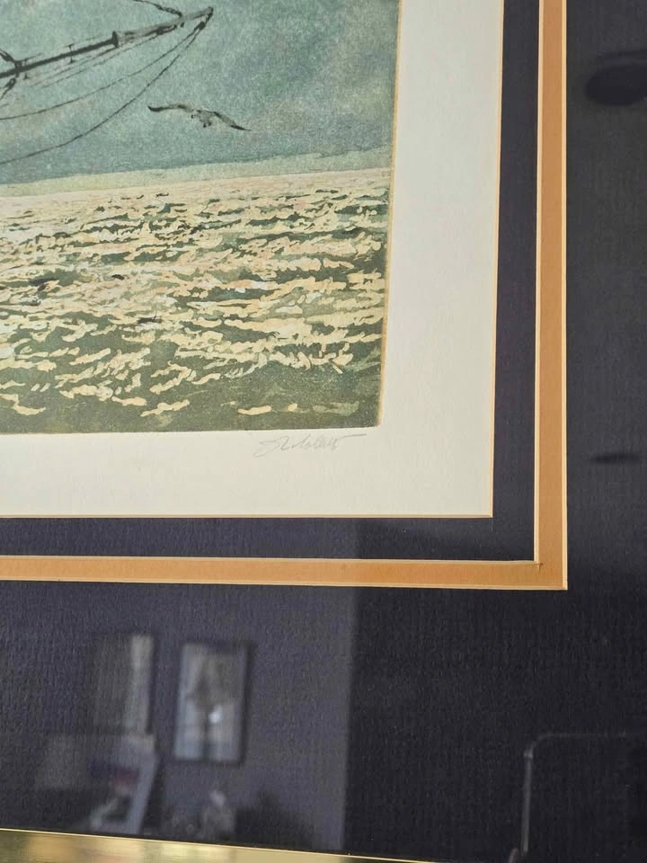 10Gorgeous vintage art by American impressionist artist John Collette. This is print 6/200. This is an etching that was colored with watercolors by the artist. The art is titled "Shrimp Boat" and depicts a boat out at sea in early dawn colors with gulls circling the masts. Very beautiful high quality art, and the frame is excellent as well. It was framed by Artist Touch Galleries in Houston Texas. Judging by the style I would estimate that the frame dates to the 90s, the print could be even older. John Collette passed away in 1997 and his wife Carol, who is also an artist, sells his remaining art on her website alongside her own. There is currently one left of this same print on her website at the price of $800 usd. Excellent condition, there's just a couple of scratches on the frame. The dimensions of the actual art are 11 3/4" by 17.5", and the dimensions of the frame are 28" by 22 1/8".