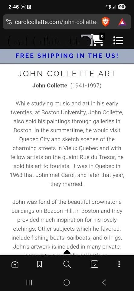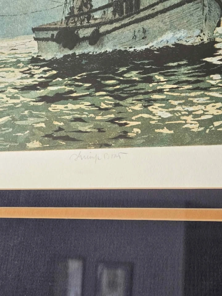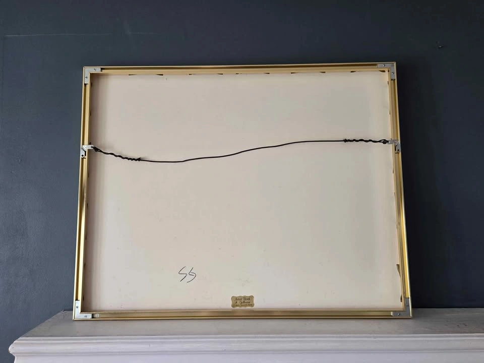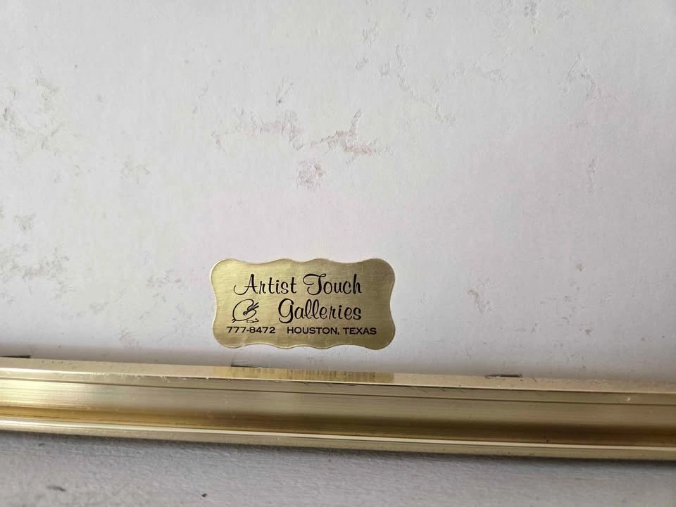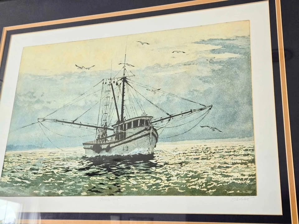 10Gorgeous vintage art by American impressionist artist John Collette. This is print 6/200. This is an etching that was colored with watercolors by the artist. The art is titled "Shrimp Boat" and depicts a boat out at sea in early dawn colors with gulls circling the masts. Very beautiful high quality art, and the frame is excellent as well. It was framed by Artist Touch Galleries in Houston Texas. Judging by the style I would estimate that the frame dates to the 90s, the print could be even older. John Collette passed away in 1997 and his wife Carol, who is also an artist, sells his remaining art on her website alongside her own. There is currently one left of this same print on her website at the price of $800 usd. Excellent condition, there's just a couple of scratches on the frame. The dimensions of the actual art are 11 3/4" by 17.5", and the dimensions of the frame are 28" by 22 1/8".