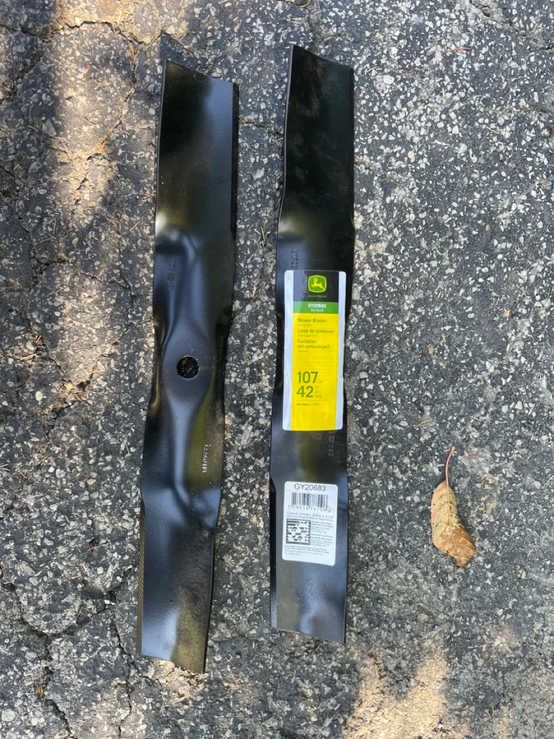 Selling a set of John Deere mower blades, model GY20683. These are 42-inch blades for your lawn tractor. One blade is still in its original packaging, the other is loose.