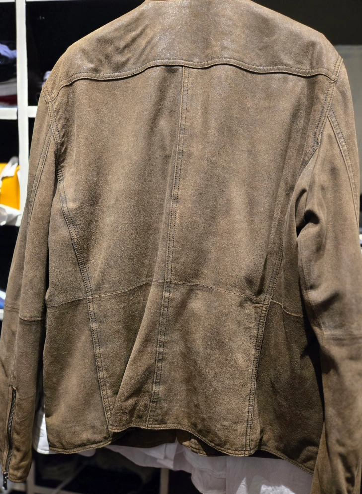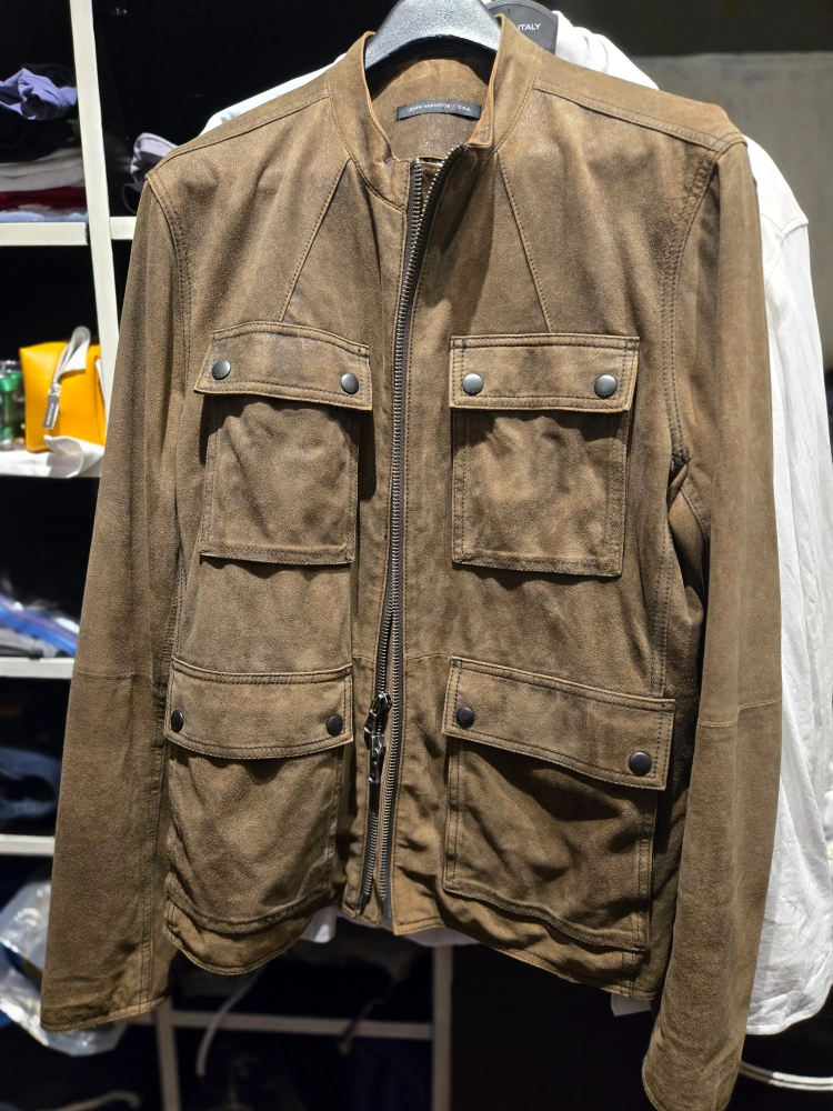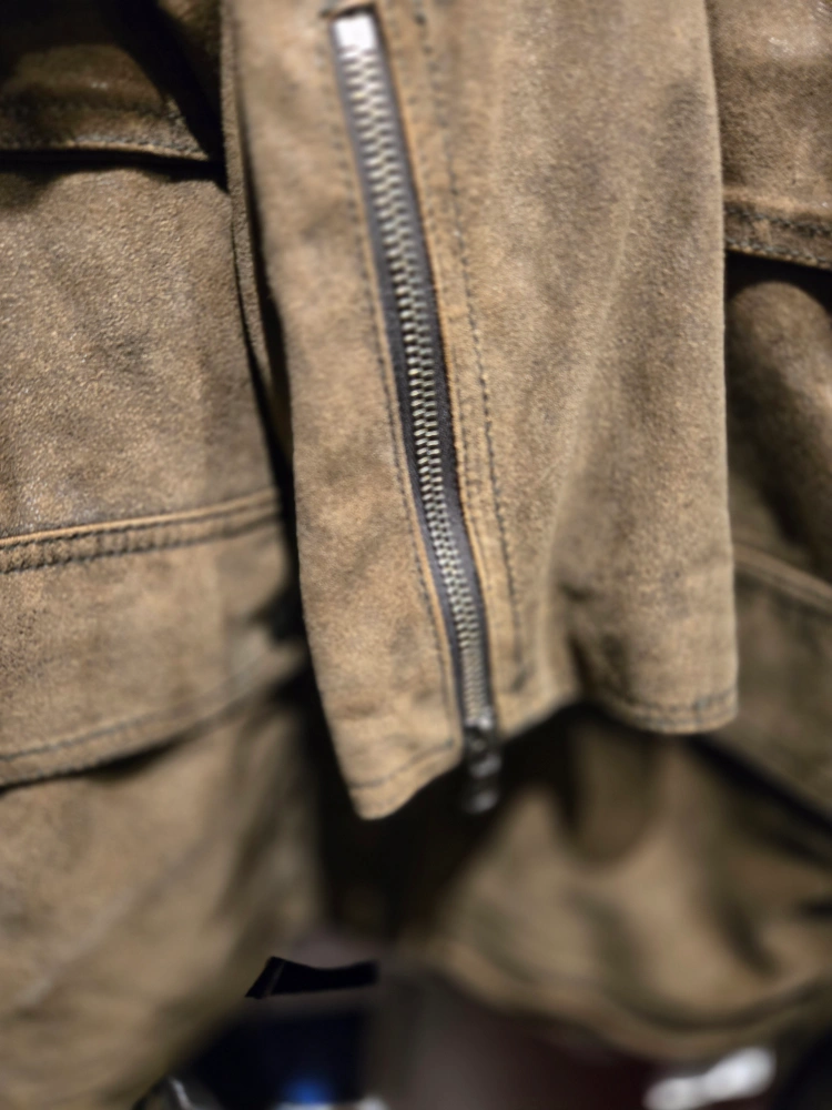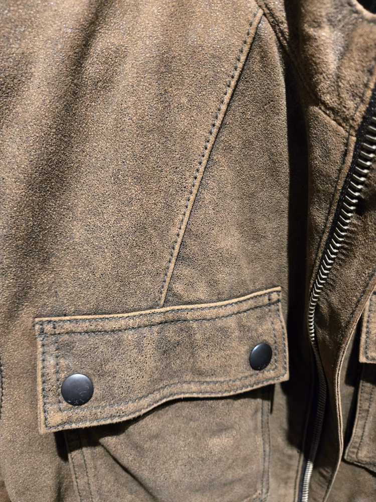 Size M, Lightweight and goat skin, tougher than cow hides; All zippers are industrial bronze by "ideal"; Used but in Perfect condition; Spring, Autumn jacket with 4 utility pockets, plus 1 inside pocket; bi-directional main zipper, fit for tight driving space; tapered action sleeves with zippers; JV signature forest green, unique texture, see high resolution pics, not a suede; slim cut, and doesn't fit me all of a sudden; Cash only, Price Firm.