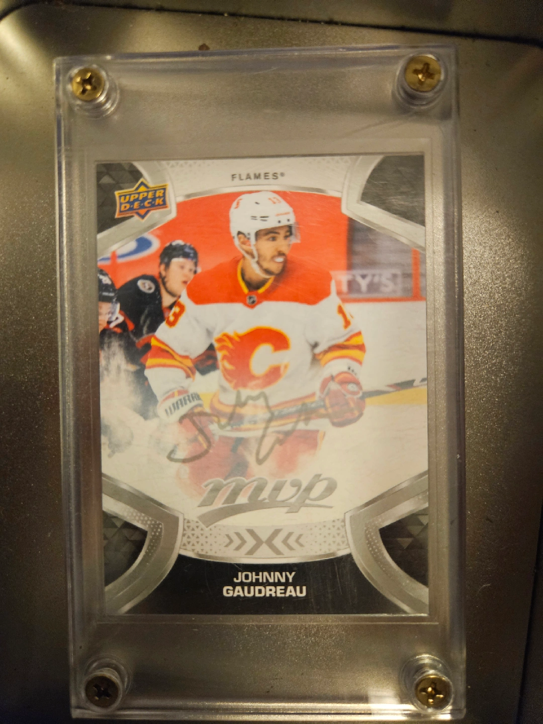 Selling a Johnny Gaudreau MVP hockey autographed card! It's in great condition and comes in a protective case. A must-have for any Flames fan or hockey card collector! Check out the stats on the back!