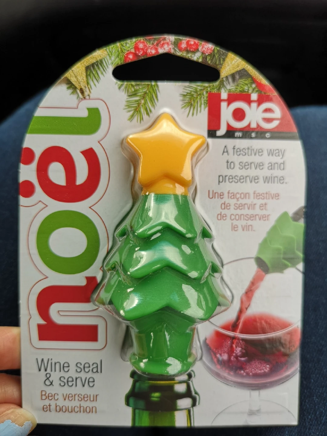 30Keep your wine fresh with this adorable Joie Noël wine seal! It's brand new in the packaging and ready to add a festive touch to your bottle. Flexible to fit most size bottles! Made of silicone and dishwasher safe