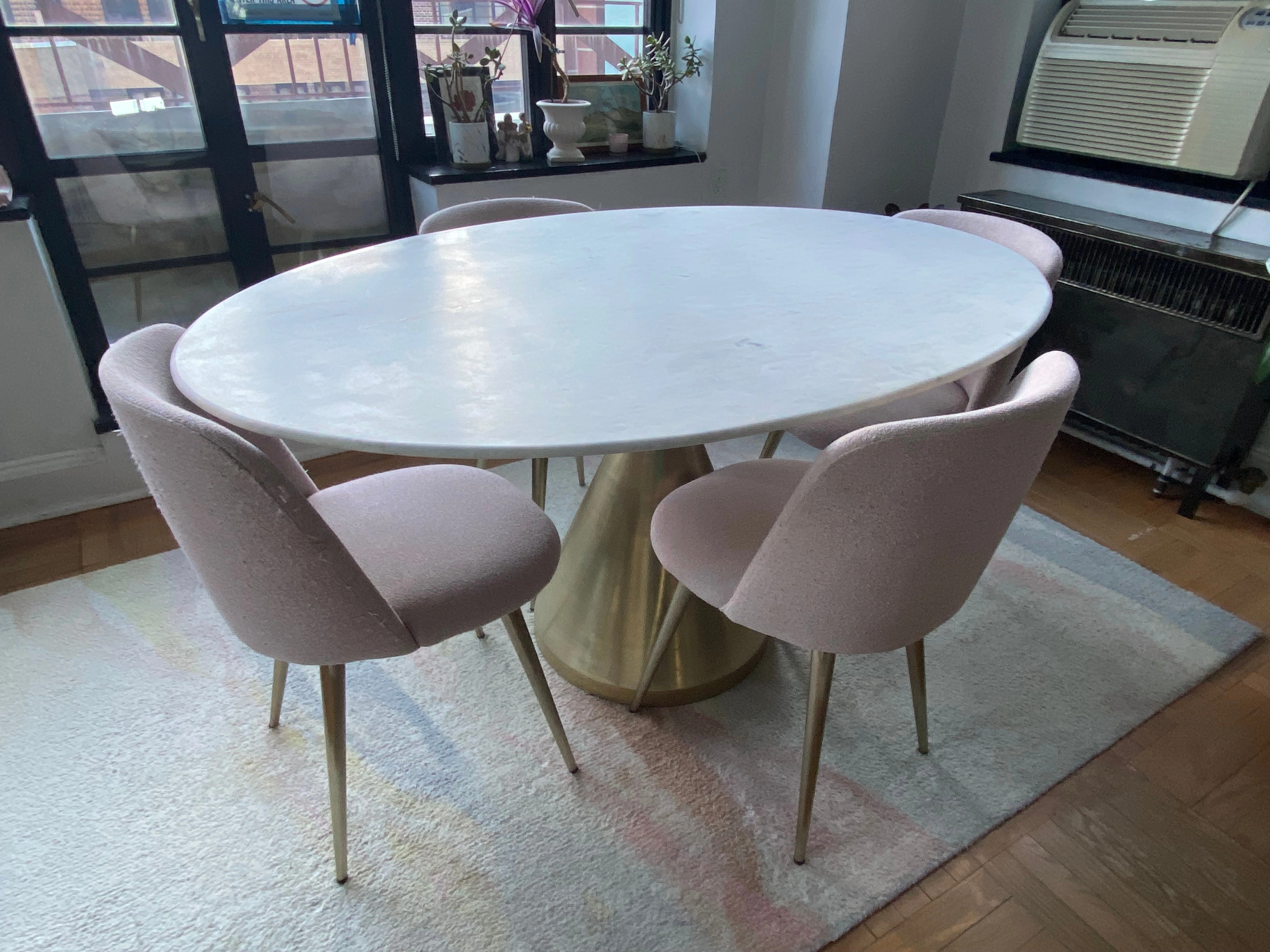 Free, if interested: Upholstered Dining Chair, Chenille Tweed, Rosette, Light Bronze (x4) - The chair fabric shows some wear/cat scratches and may benefit from reupholstering, but the structure and overall condition are very good. They can be included free with the table if preferred.