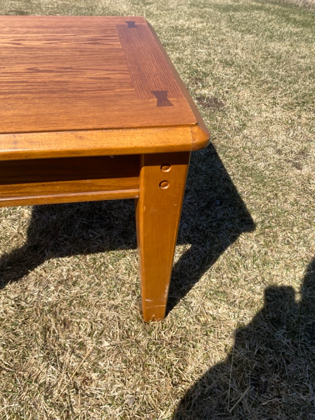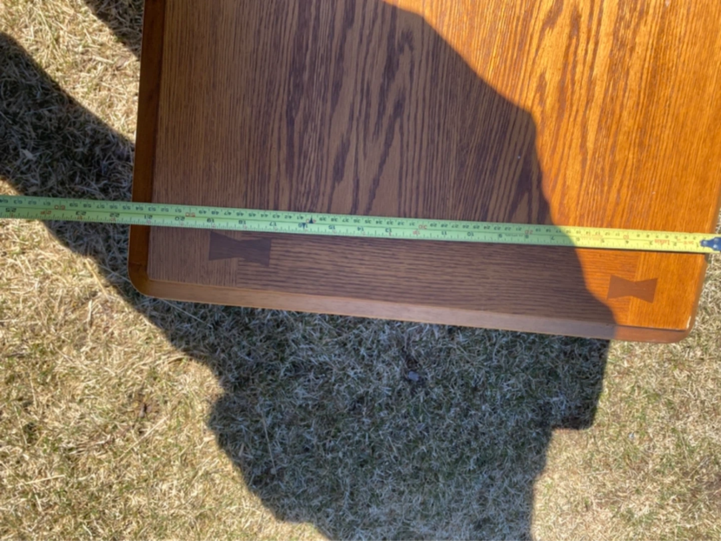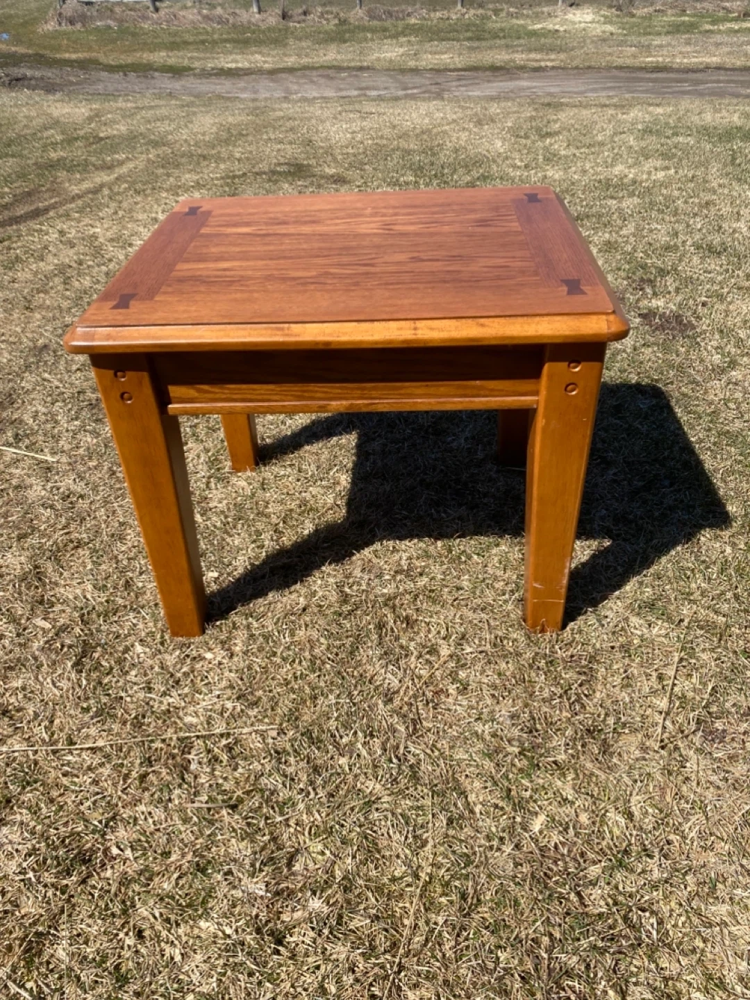 Wooden side table with a dark oak finish. The top has inlaid wood details. Table height is 21.5 inches. Table width is approximately 23 inches.
