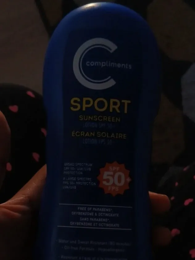 Compliments Sport Sunscreen Lotion with SPF 50+ protection. It's broad spectrum UVA/UVB and water and sweat resistant for up to 80 minutes. This formula is free of parabens, oxybenzone, and octinoxate. It's also oil-free and hypoallergenic!