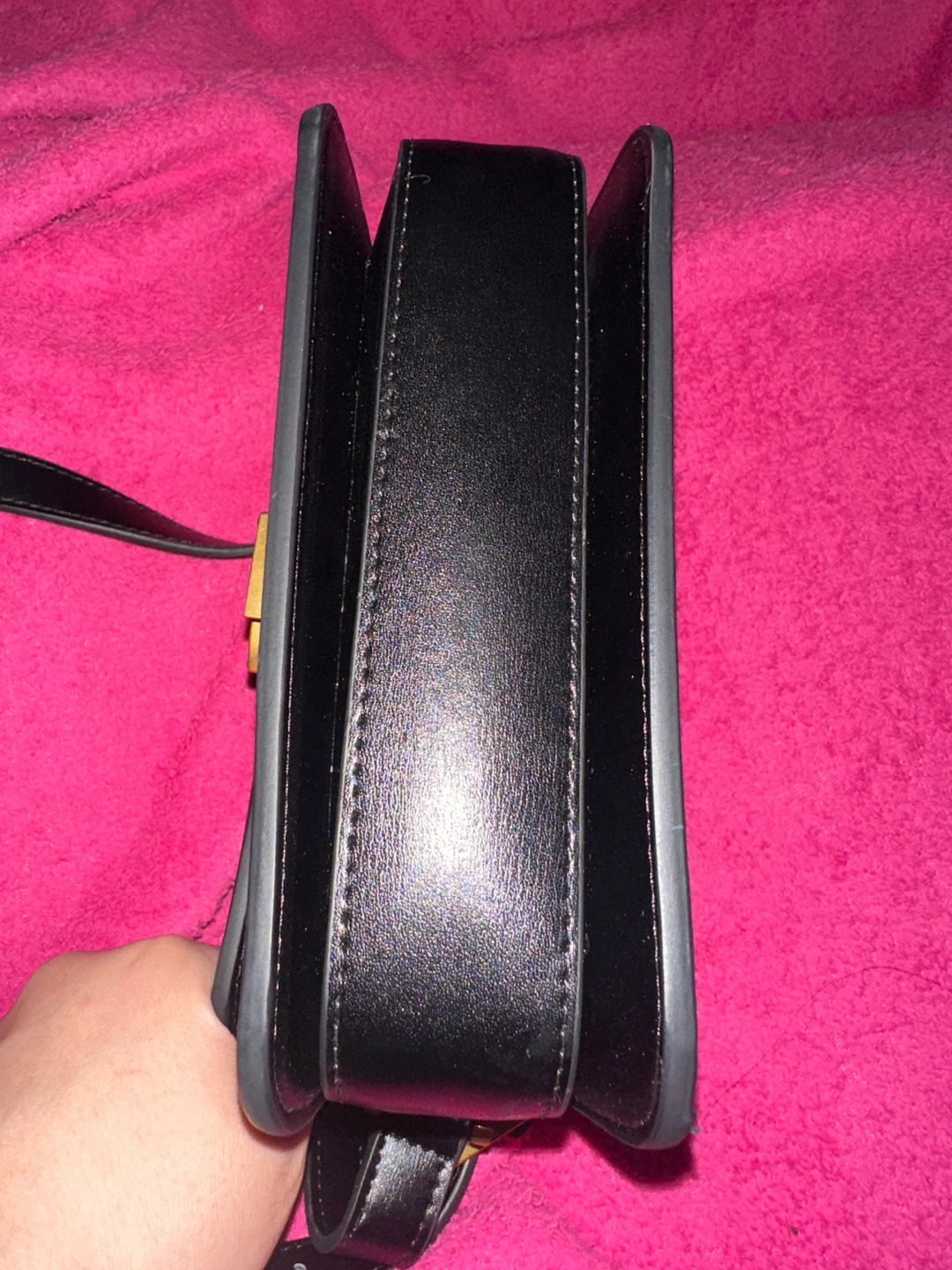 This is a Saint Laurent shoulder bag in black leather. It has a gold-tone YSL logo and adjustable strap. The bag's dimensions are approximately 20cm wide, 14cm high, and 6cm deep. This bag is perfect for a night out or everyday use.