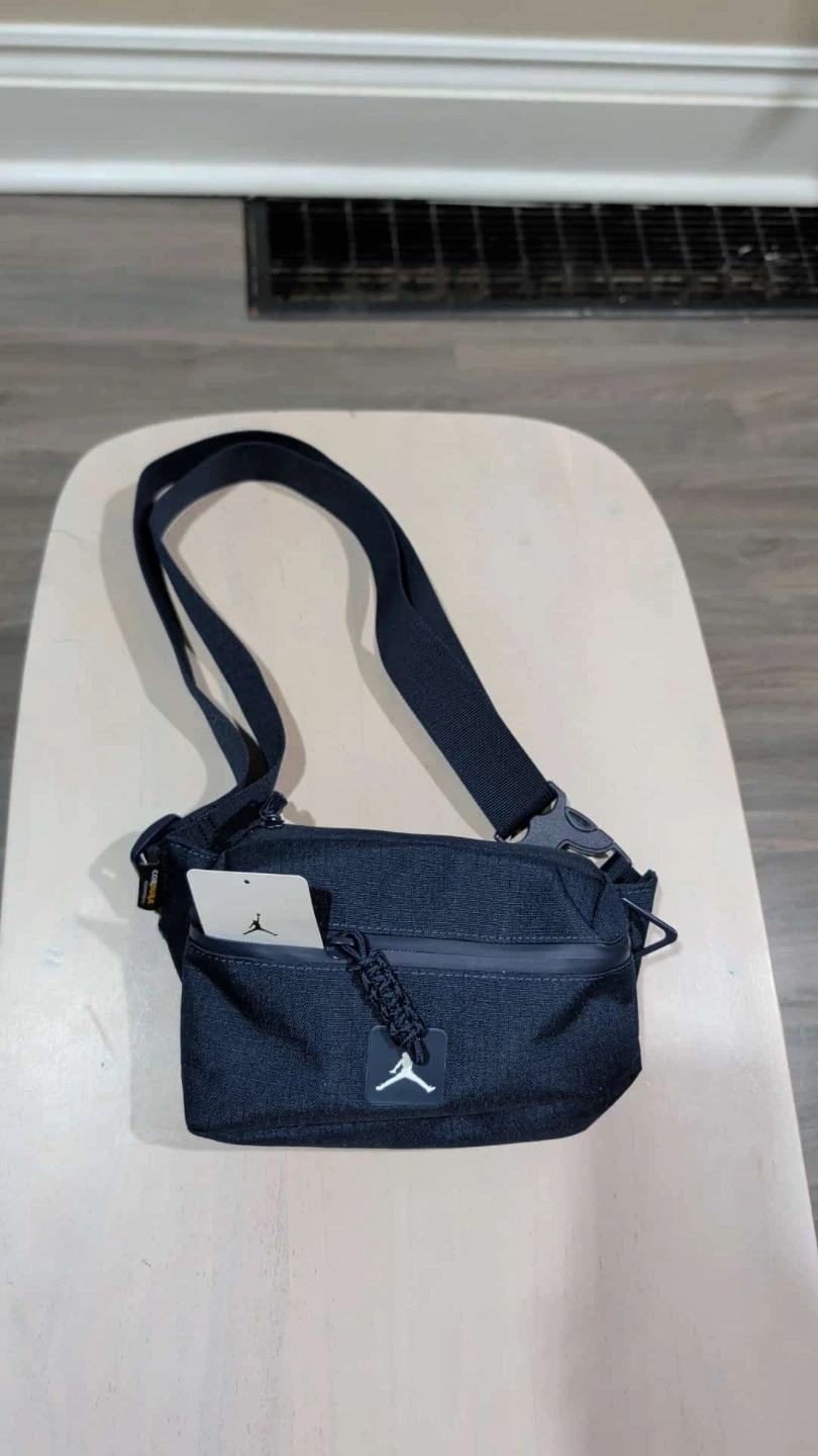 This is a navy blue Jordan crossbody bag. It's made with durable material and features an adjustable strap. A small tag is included with the Jordan Jumpman logo.