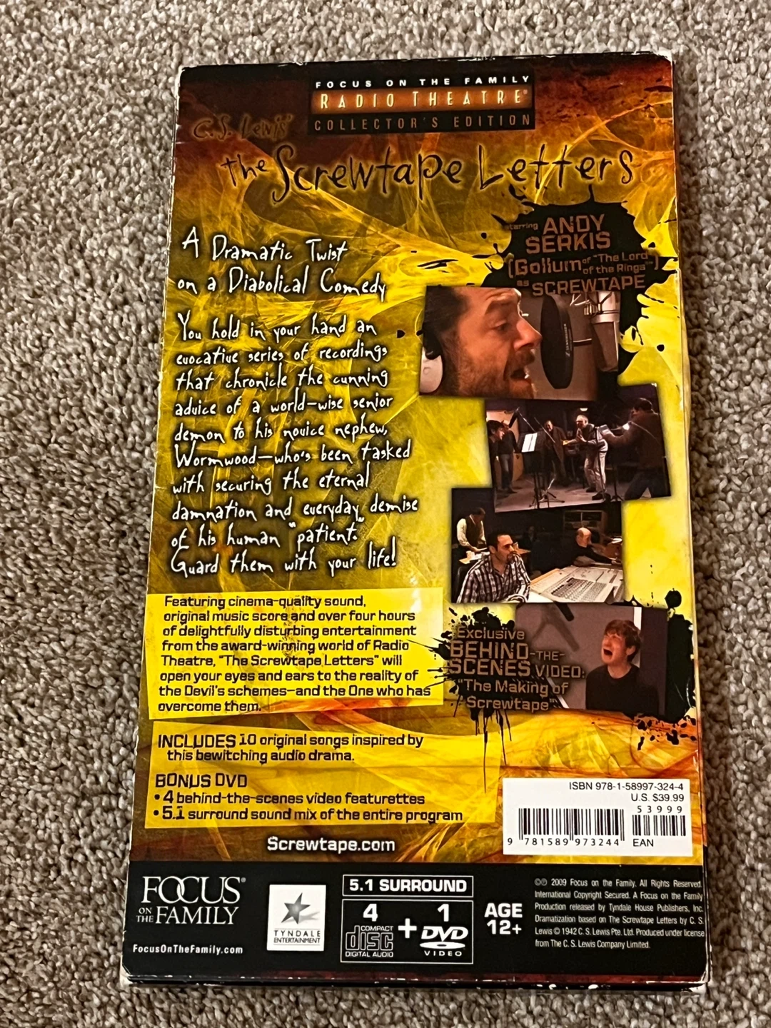 This collector's edition features a full-cast dramatization of C.S. Lewis' diabolical classic, The Screwtape Letters. It includes 4 CDs of the radio theatre production and 1 bonus DVD with behind-the-scenes video features and 5.1 surround sound mix of the entire program. Focus on the Family Radio Theatre presents this dramatic audio drama.