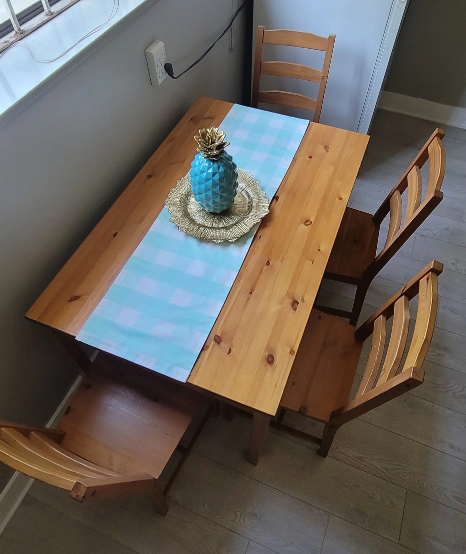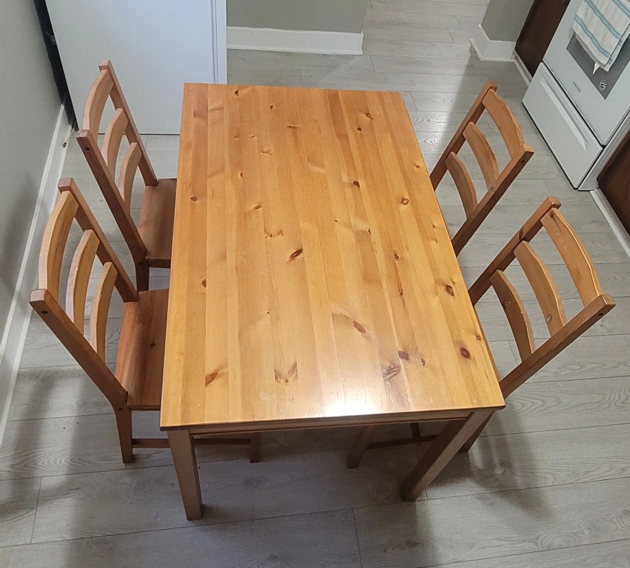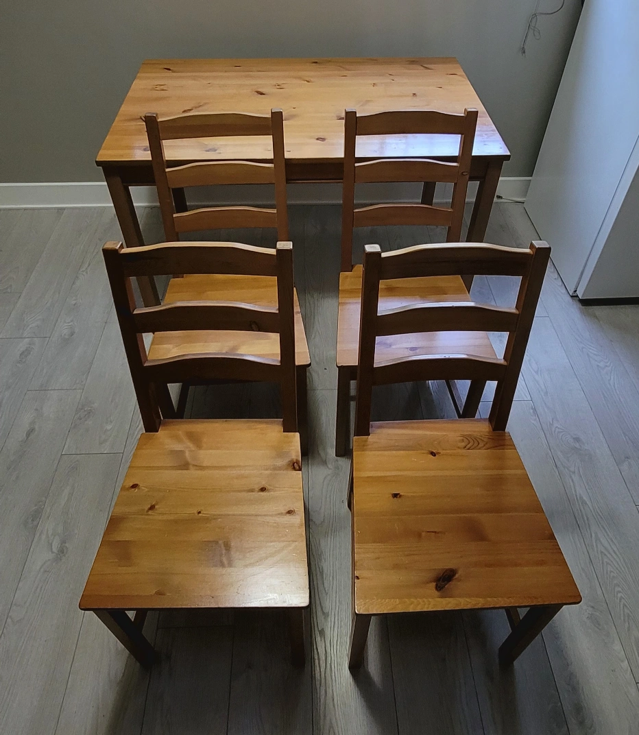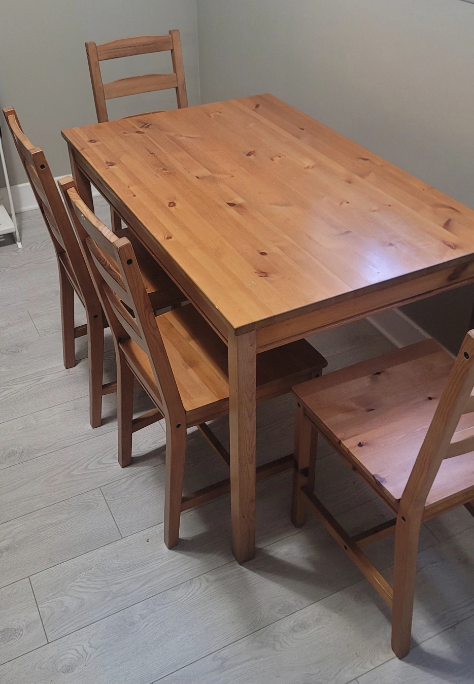 Jokkmokk Dinner Table with 4 chairs. * Durable solid wood and antique colour finish that will outlast many years of use. * Compact dimensions (ideal for kitchen or breakfast nook). * Table size: Height of 29.1339” (74 cm), width of 29.1339” (74 cm), and length of 46.4567” (118 cm). * Chair Size: Height of 17.3228” (44 cm), width of 16.1417” (41 cm), and depth of 16.1417” (41 cm).