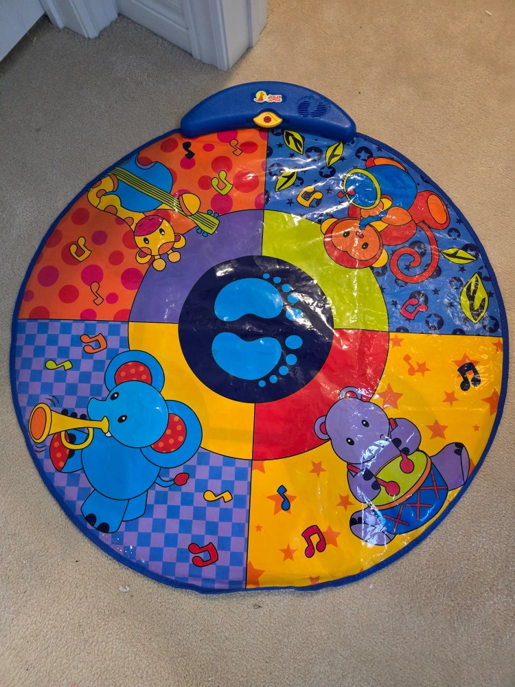 90Baby play mat featuring musical instruments and animals. Features a central section with footprints and colourful segments. Includes an attached sound bar.