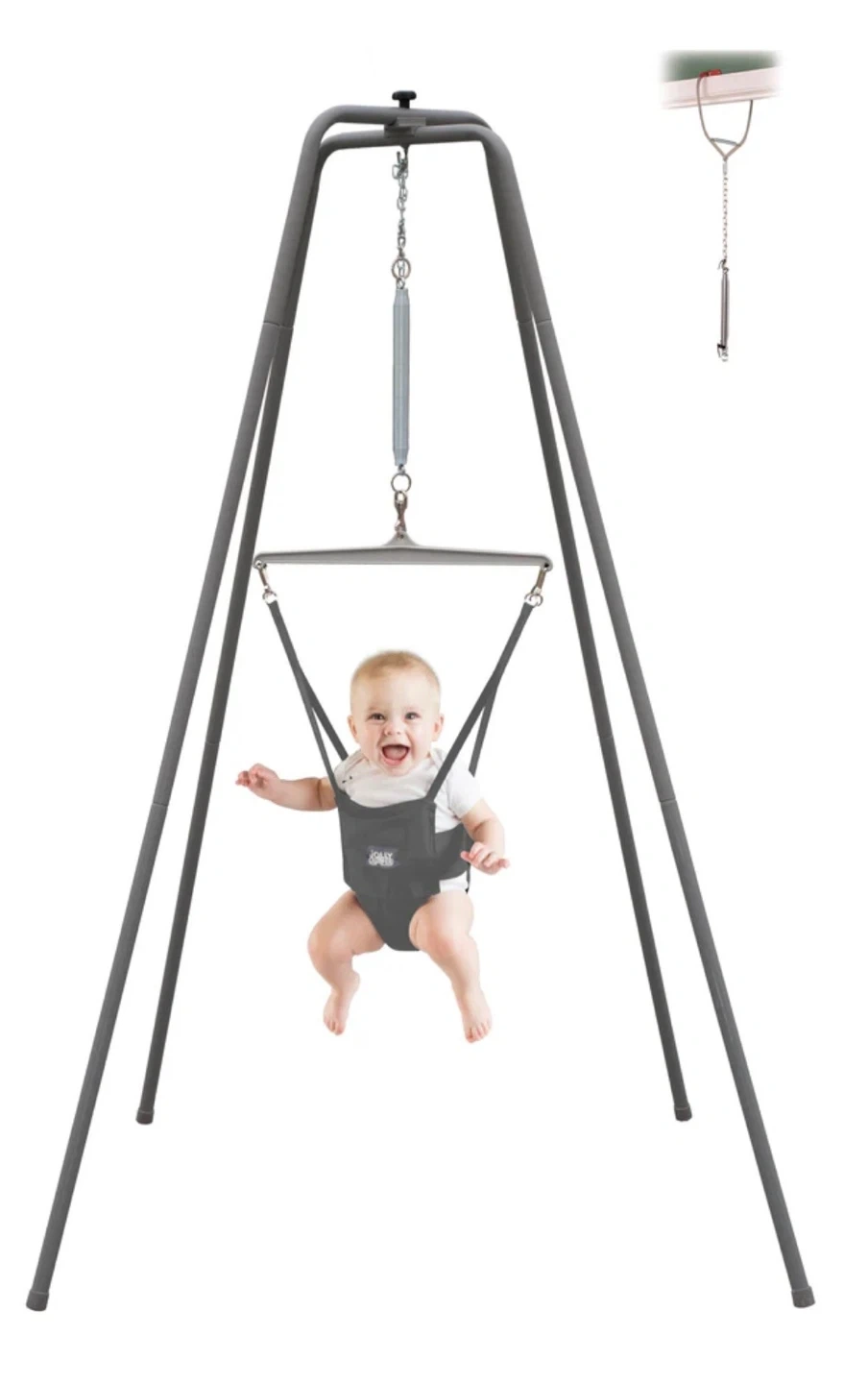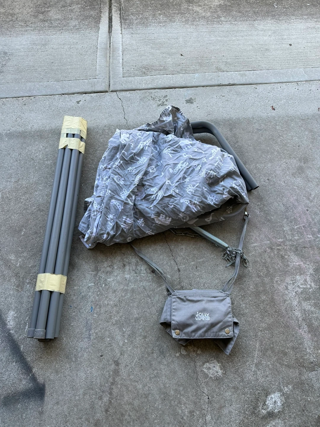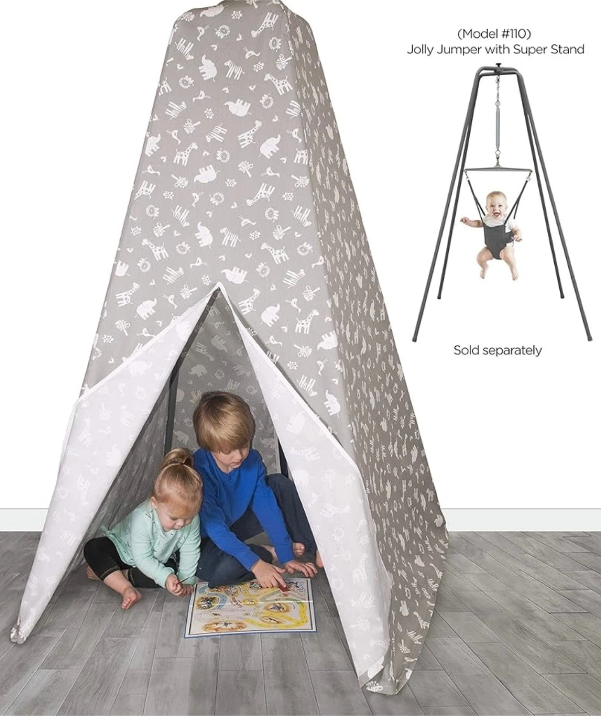Selling a Jolly Jumper with Super Stand! It's in great condition and ready for a new little one. It comes with the stand, which makes it easy to set up anywhere in your home. Your baby will love bouncing and playing in this jumper! Comes with 2 Mat’s to put under your babies feet for comfort and play! Stand is $249 and tent is $55 brand new