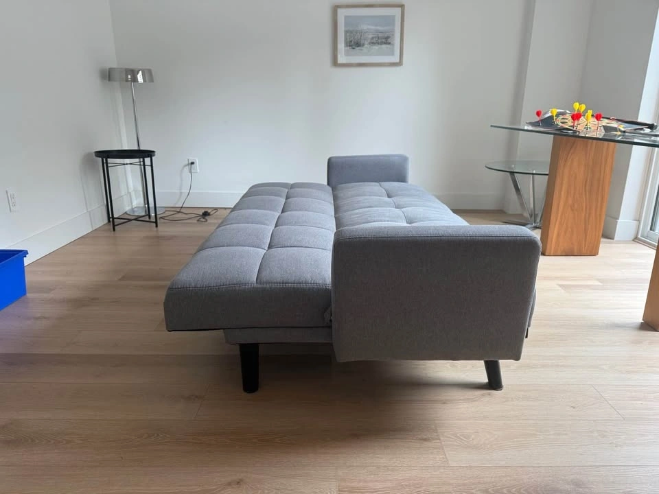 Mo’s Collection Heiderbed sofa / sleeper in grey fabric. Converts easily from sofa to bed and is comfortable and supportive. Clean, modern design with tufted cushions.