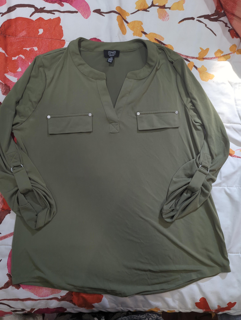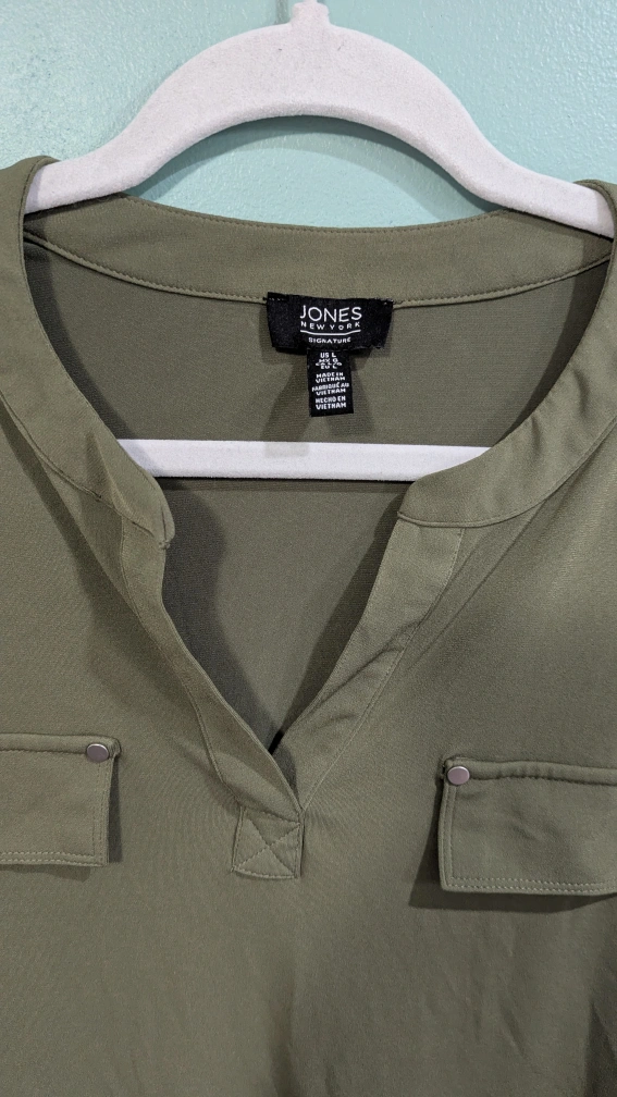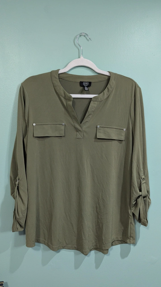Here's a Jones New York blouse in a lovely olive green colour! It features a V-neck and long sleeves that can be rolled up and secured with buttoned tabs. It also has two small decorative pockets on the front. A great addition to any wardrobe!