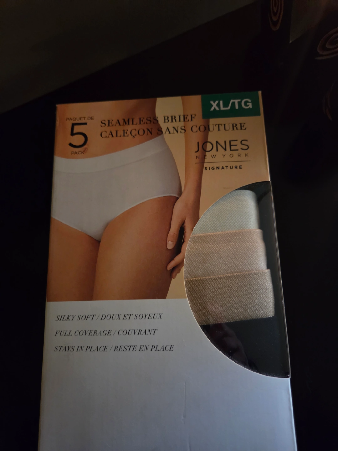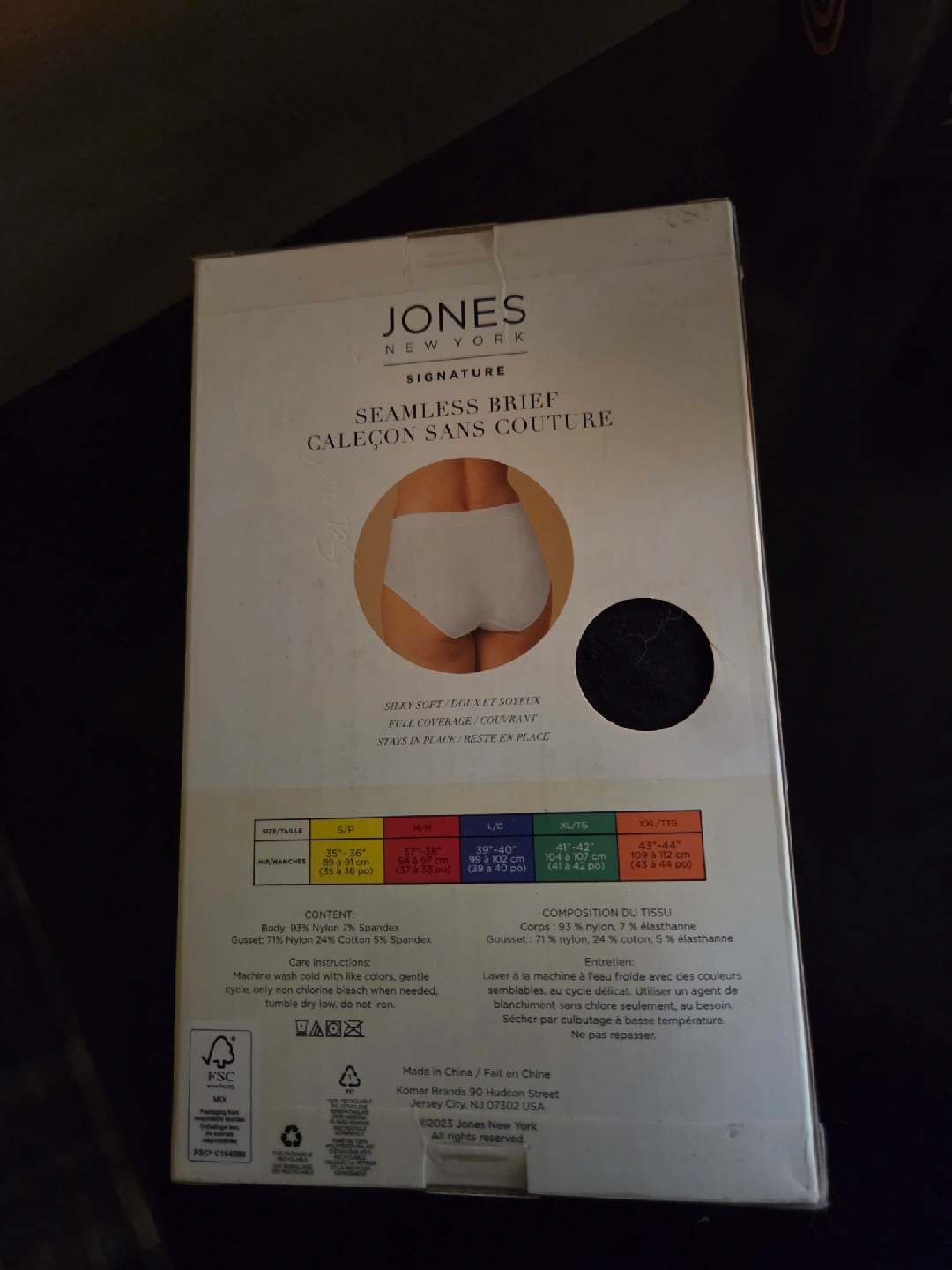 10Selling a pack of 5 Jones New York Signature seamless briefs. They are size XL/TG. The briefs are silky soft, provide full coverage, and stay in place. Material composition is 71% nylon, 24% cotton, and 5% spandex