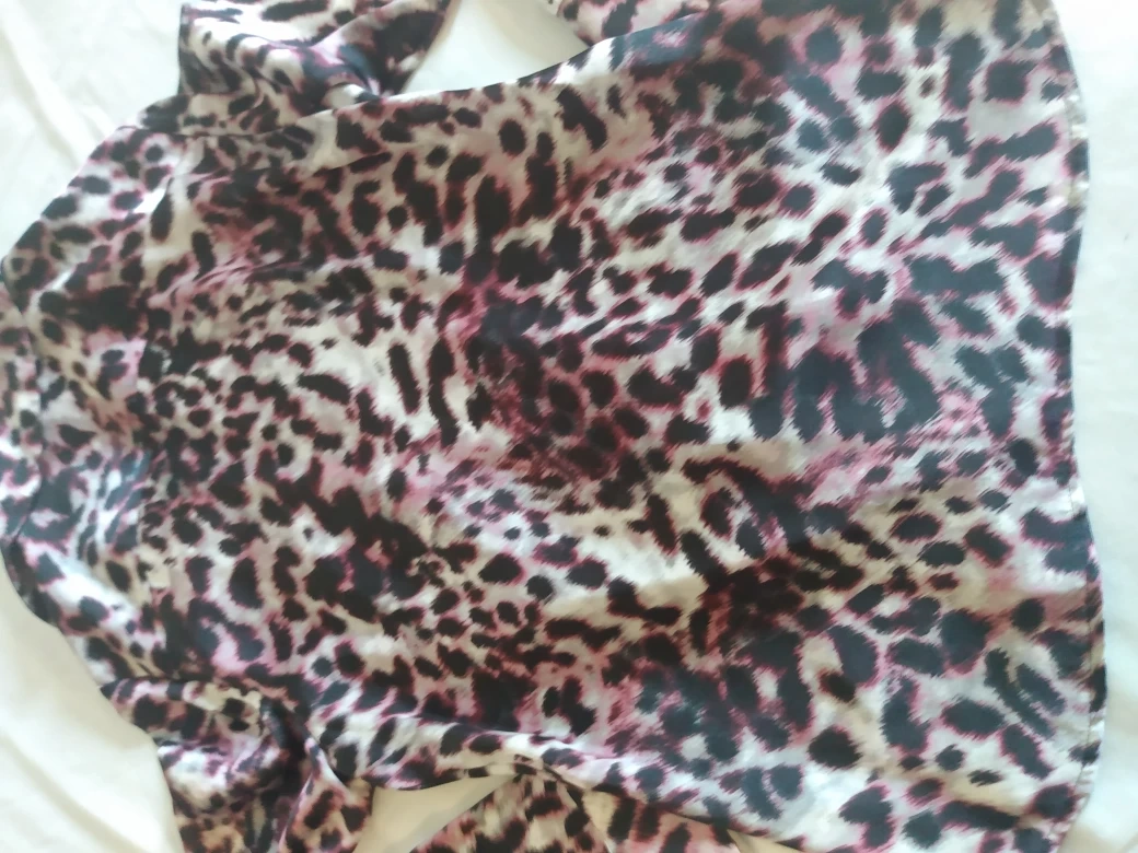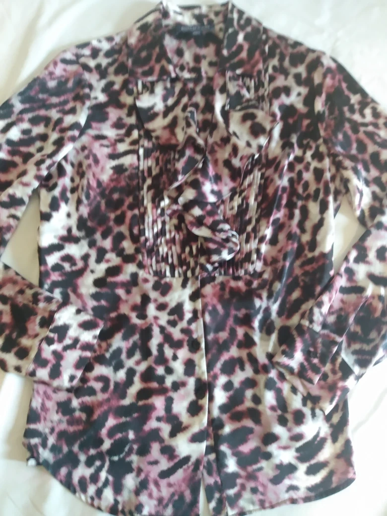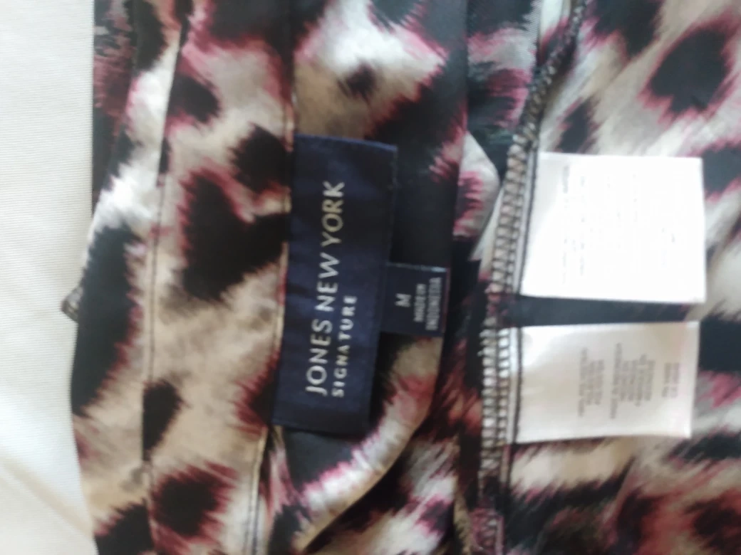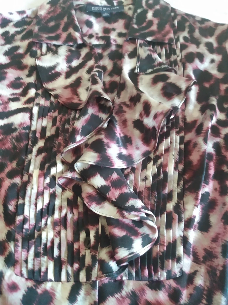 1000+FREECYCLE Jones New York Signature Women's long-sleeved blouse. Size medium. Leopard print. Features a ruffled front and button closure. Made in Indonesia 100% Polyester. Machine Washable. Non smoking home. I can deliver to any Skytrain Station you choose.