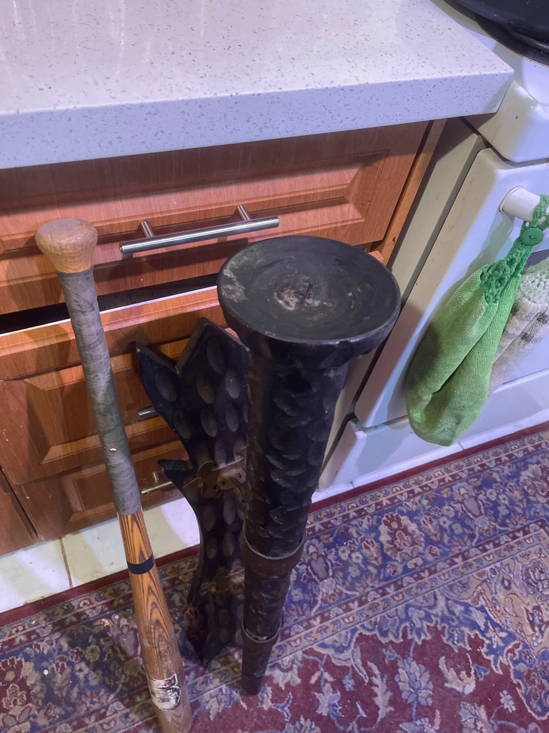 This unique sculpture features carved dark wood with intricate metal chain and accent details. It stands as a striking decorative piece. The dark wood has a rustic, textured finish